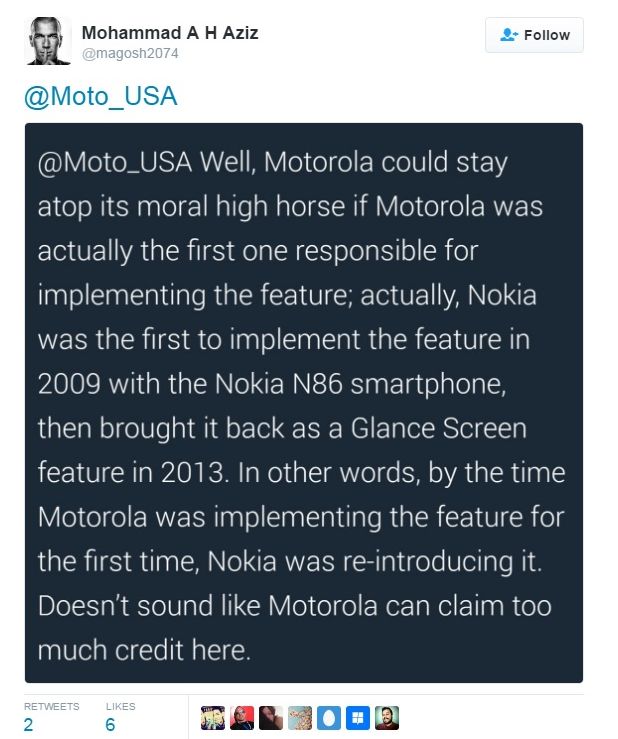 Funcţia Always On debuta pe Galaxy S7, cu destul de mult tam-tam, fiind promovată intens de Samsung. Totuşi, nu Samsung a inventat această idee şi ne amintim imediat că şi pe modelele Lumia primeam notificări, ora si date meteo cu ecranul in standby, sub forma lui Glance. După cum era de aşteptat fanii Nokia au reacţionat la tweet-ul Moto şi au atras atenţia că de fapt funcţia datează de pe vremea lui Nokia N9, adică din 2011.