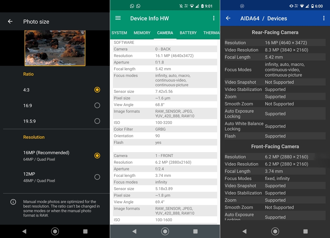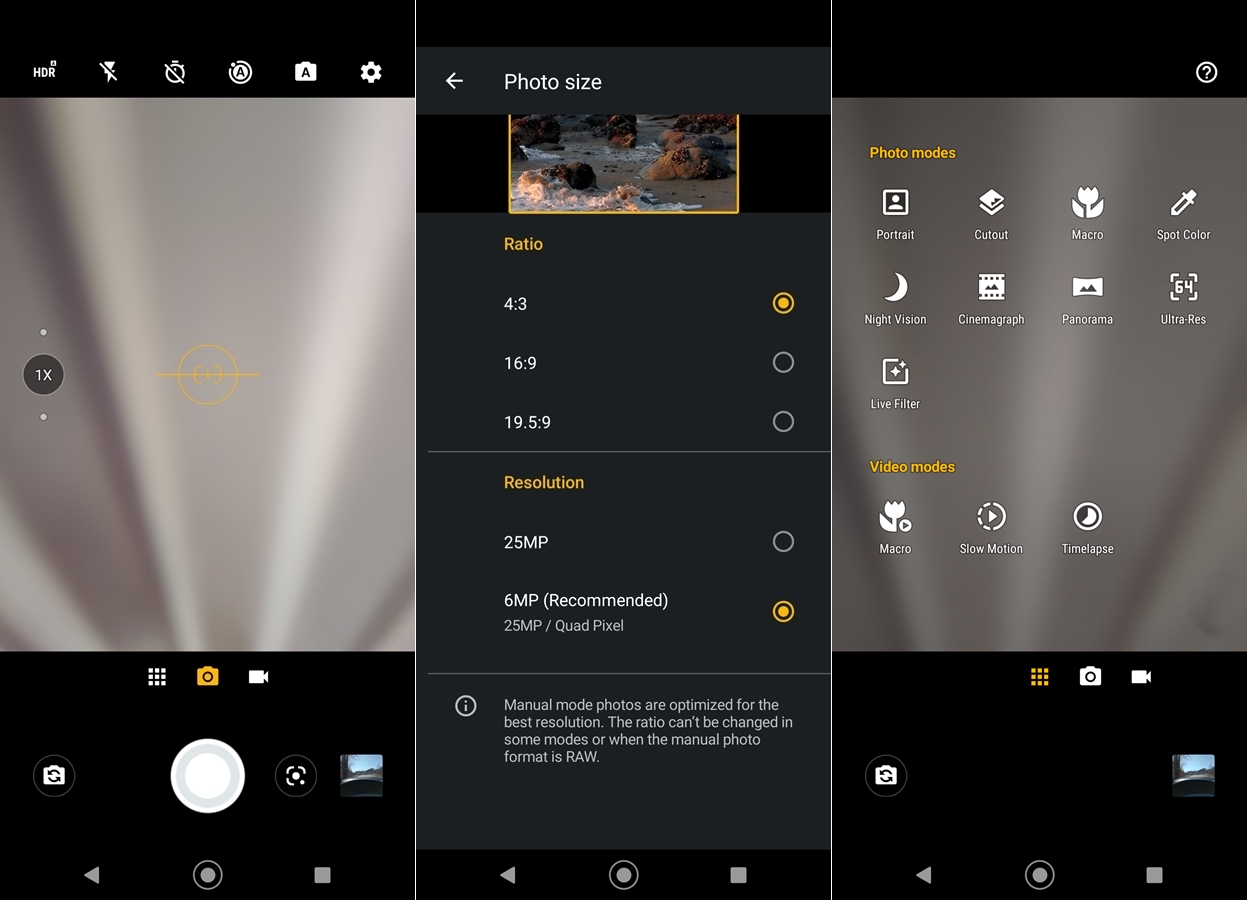 În setări se poate opta pentru fotografii în format 4:3, 16:9 sau 19.5:9 și descoperim la ce rezoluții putem realiza fotografii. Setup-ul foto din spate cu senzor principal de 64 mpx permite realizarea de fotografii la o calitate de 12 sau 16 mpx folosindu-se tehnica Quad Pixel prin care se combină 4 pixeli în 1. Camera selfie este o unitate de 25 mpx și la rândul său livrează fotografii prin tehnologia Quad Pixel, la o rezoluție de 6 mpx sau fără acest artificiu, la 25 mpx.