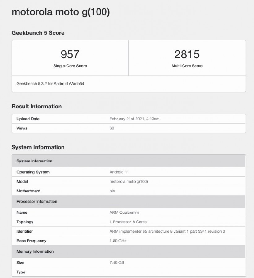 Benchmark-ul de față indică denumirea Moto G100 asociată acestui telefon și descoperim pe această cale prezența procesorului octa-core Snapdragon 870 de la interior și a unei configurații cu 8 GB RAM. De asemenea, aflăm că Android 11 rulează din fabrică și că se ajunge la un scor single-core de 957 puncte, respectiv unul multi-core de 2815 puncte.