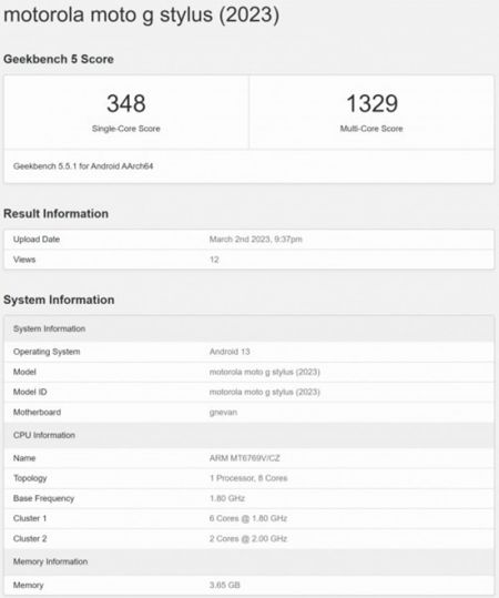 Conform listării în aplicația benchmark, Motorola Moto G Stylus (2023) vine cu Android 13 din fabrică. Configurația testată are 4 GB de memorie RAM și 128 GB de stocare, dar zvonurile spun că terminalul va primi și o variantă cu 6 GB RAM și 256 GB de stocare. Moto G Stylus (2023) are sub capotă un procesor MediaTek octa-core, cu 6 nuclee tactate la 1.8GHz și două nuclee tactate la 2GHz. Pare a fi vorba despre un CPU MediaTek Helio G85 sau G88.