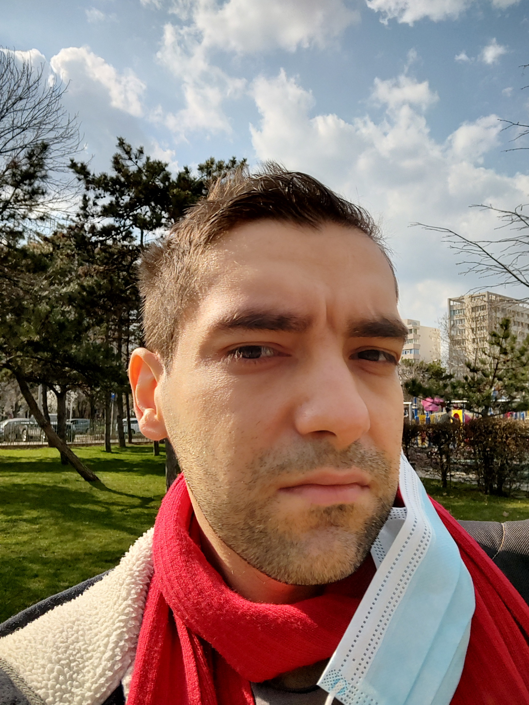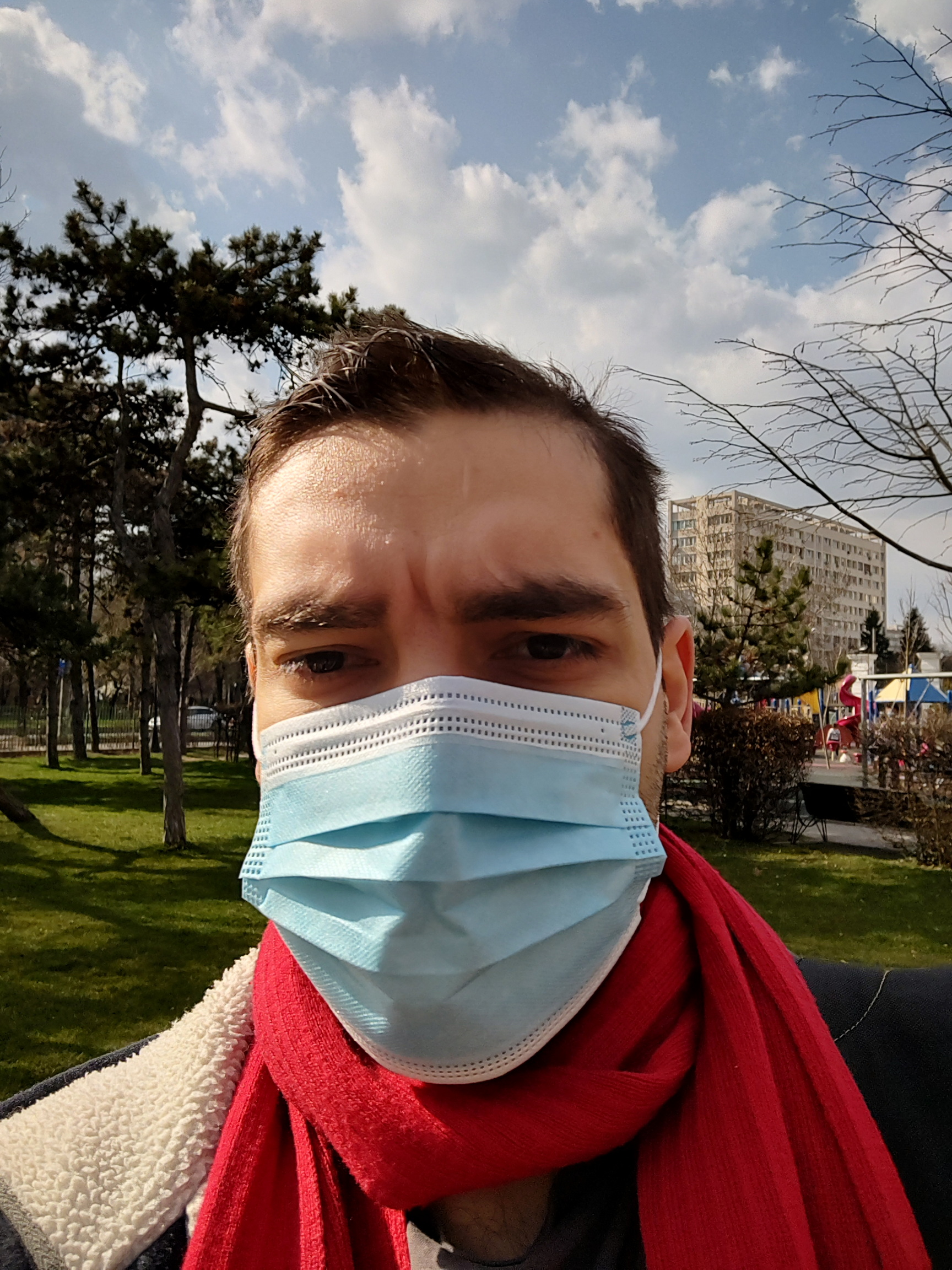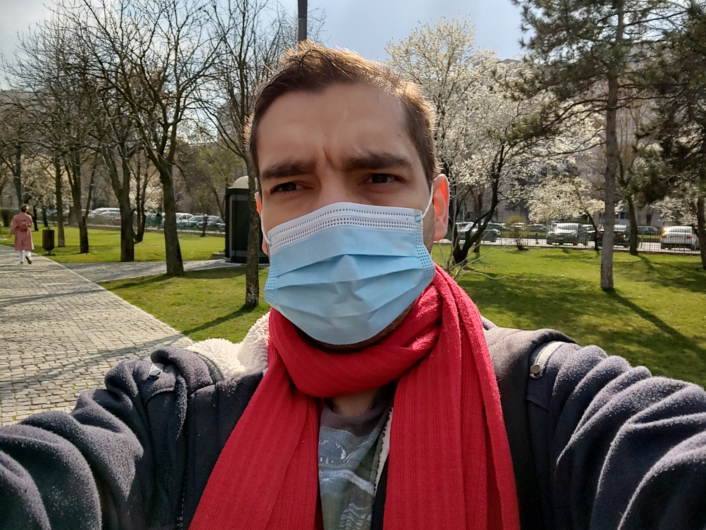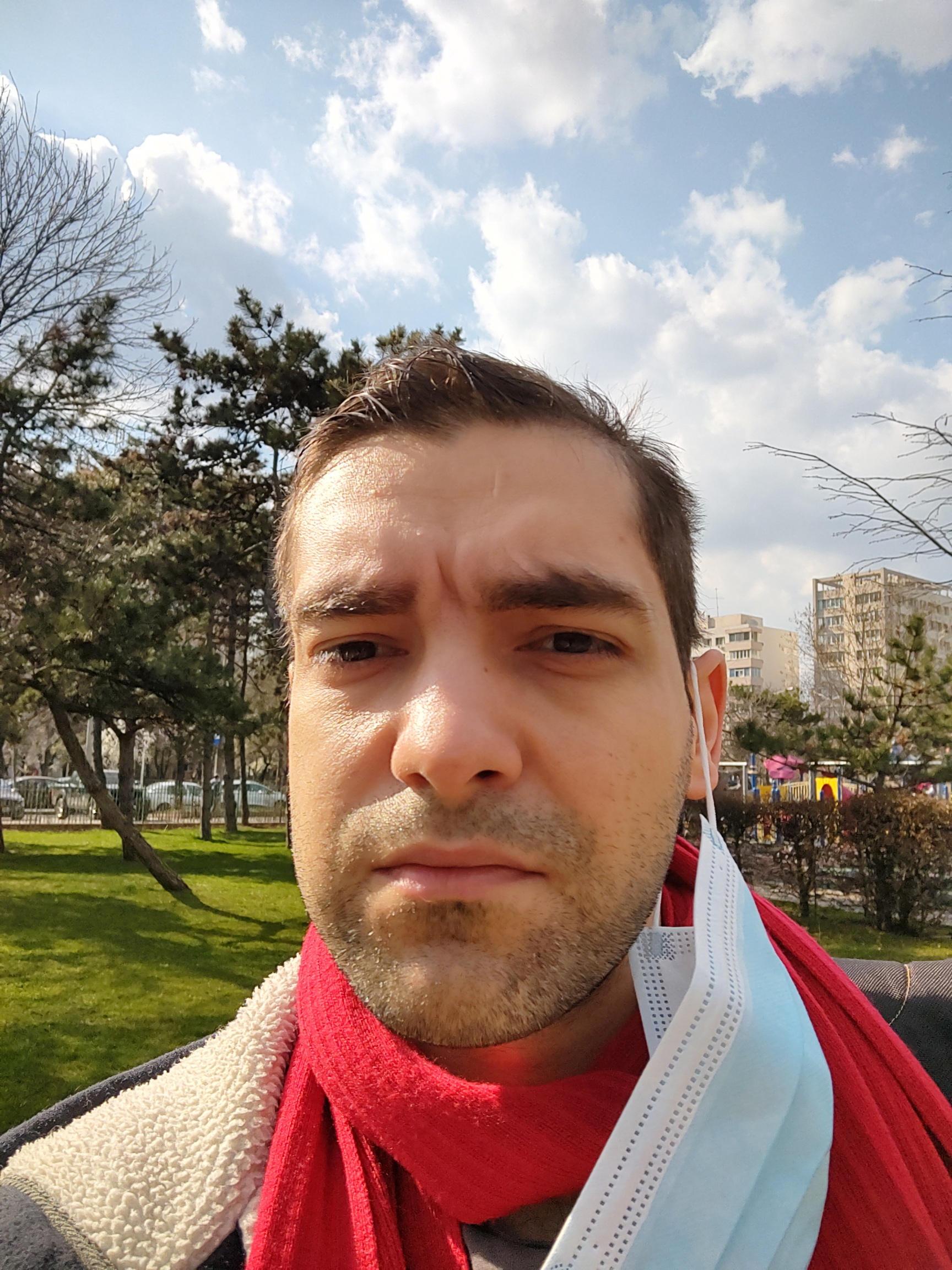 Începem acum şi cu galeria foto, realizată în Bucureşti, în Parcul IOR pe 30 martie 2021. Era o zi friguroasă dar însorită, lucru relevat de fularul de la gât dar şi cerul senin. Camera principală prinde bine detalii şi culori şi cea ultrawide ne arată că nu e una generică de 8 MP, capturând şi ea destule detalii. Se observă totuşi curbura cadrelor. Cantitea de zgomot creşte sesizabil totuşi când treci de la captura cu camera principală la cea ultrawide, aşa cum vedem la acele capturi cu 3 brazi (sau 4?). Se ridică şi expunerea puţin.