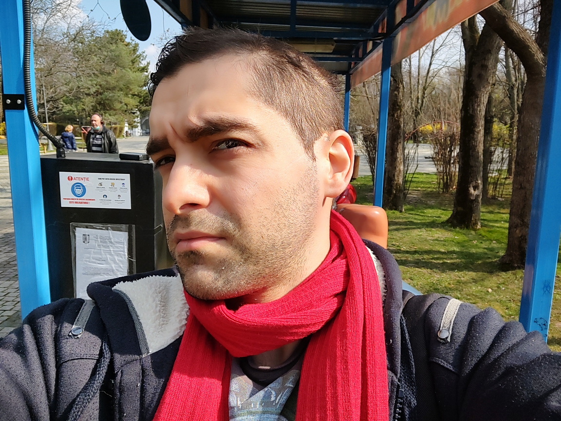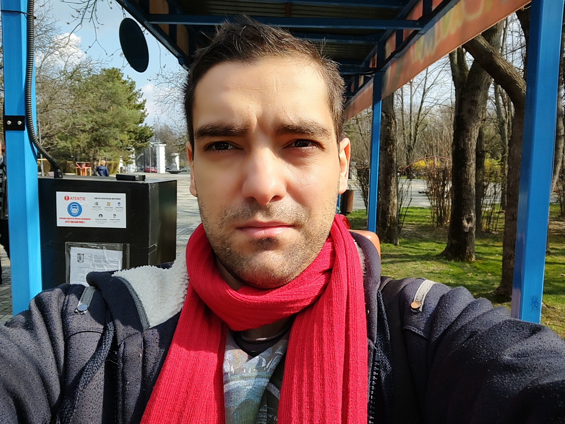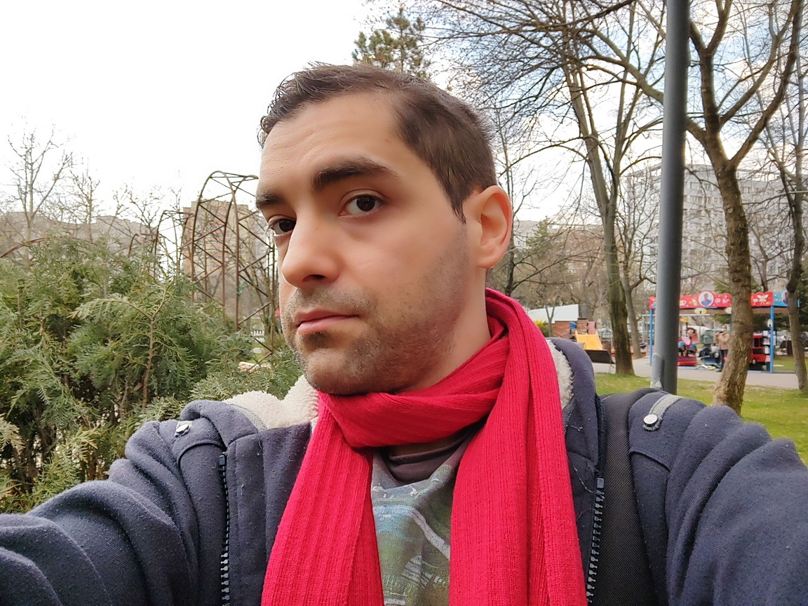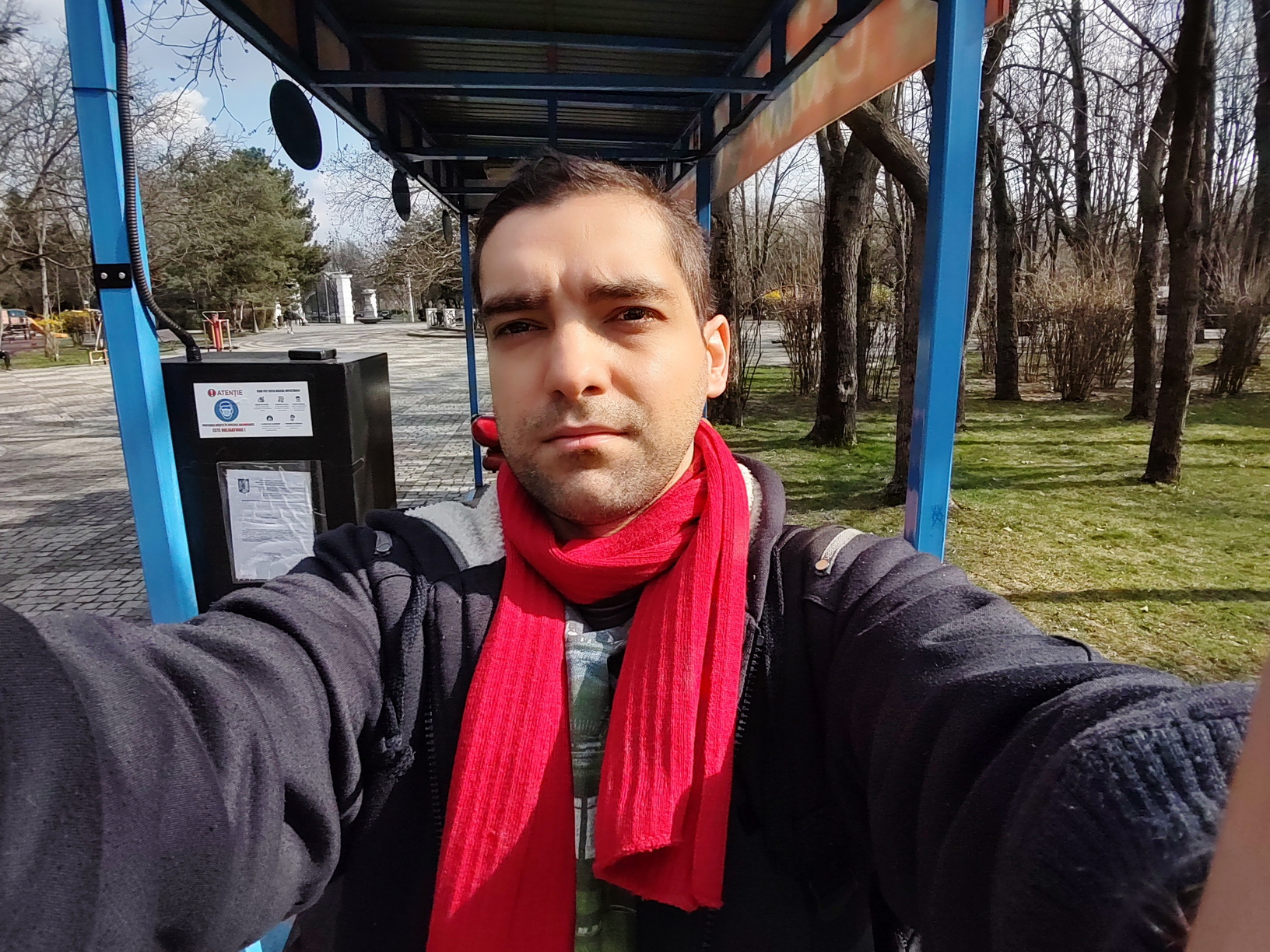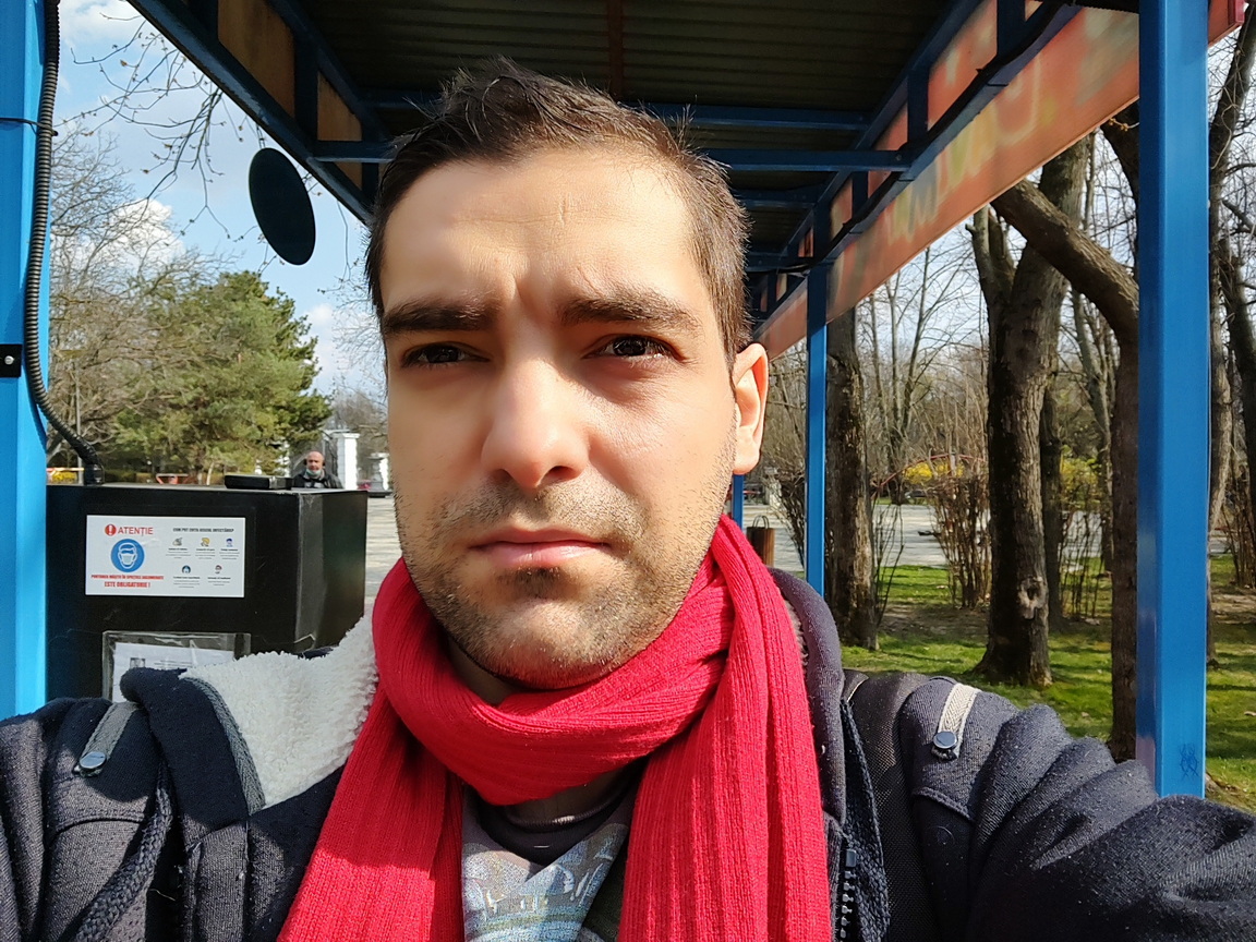 Prima salvă de selfie-uri nu mă impresionează, nu văd detaliile la nivel de porişi fata e că de ceară. Captura ultrawide e binevenită pentru lărgimea de cadru, în care mai înghesui şi peisaj şi priteteni, dar gazonul şi copacii din spatele meu sunt "soft" rău şi lipsite de detalii. Bokeh arata mai clar ridurile de expresie, coşurile, firele de păr, freza proaspăt făcută după tunsoare şi textura fularului sau scamele gecii. Decupare precisă a capului faţă de fundal.