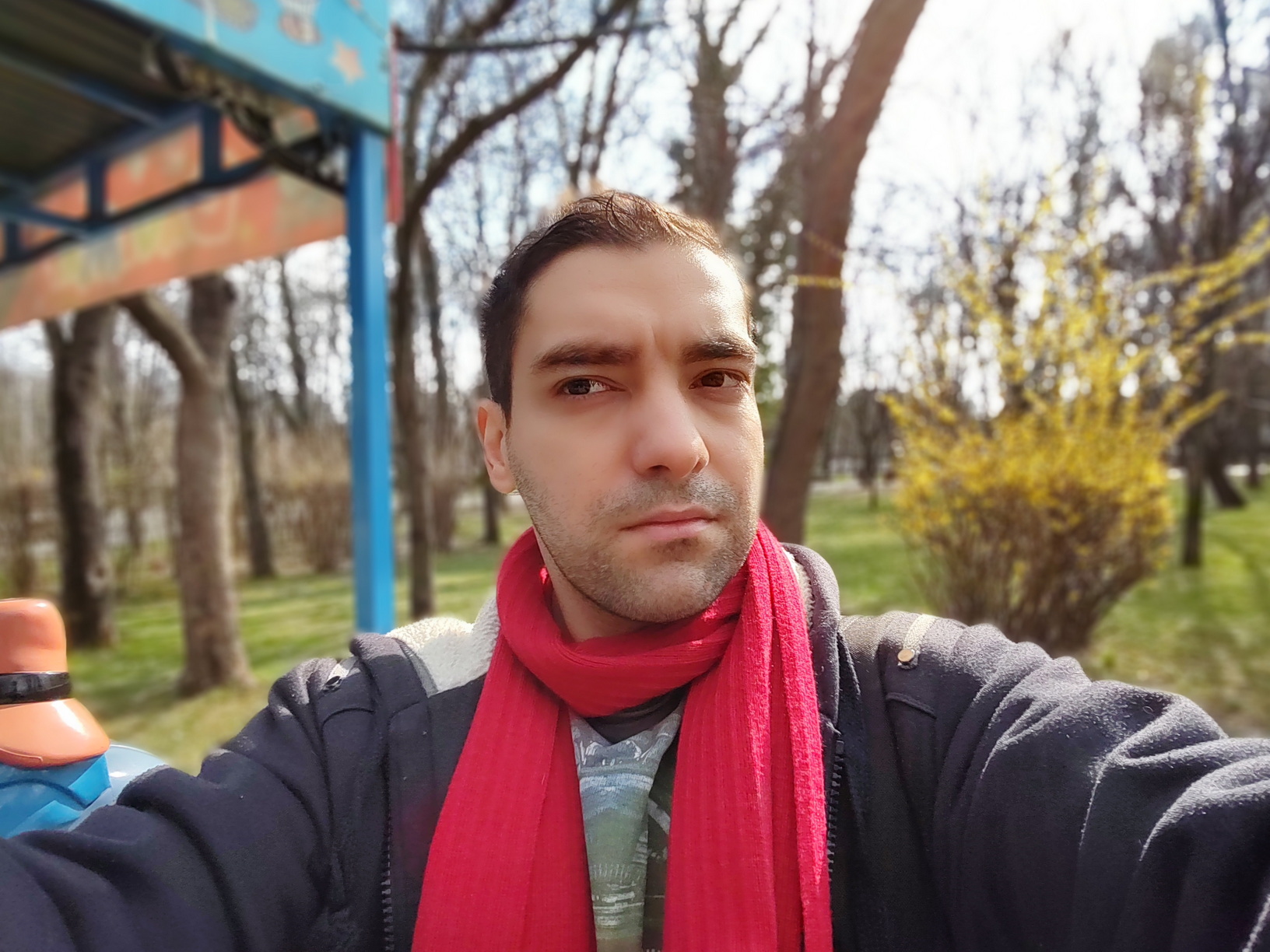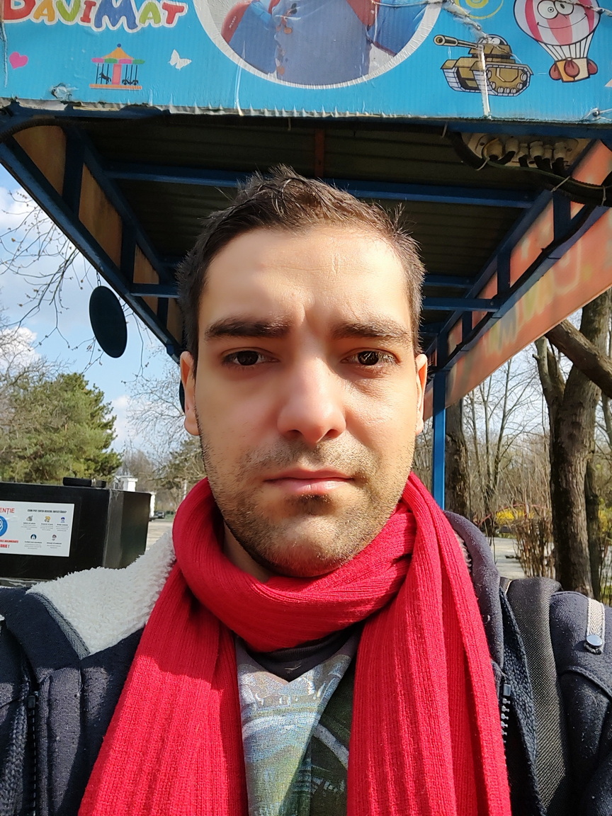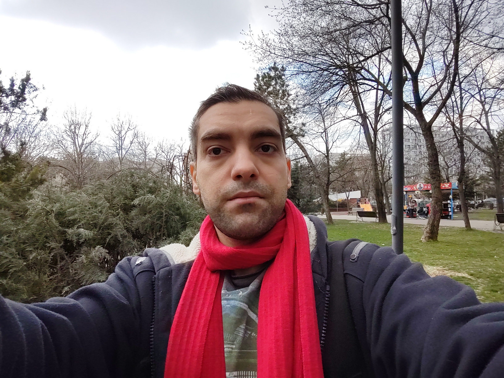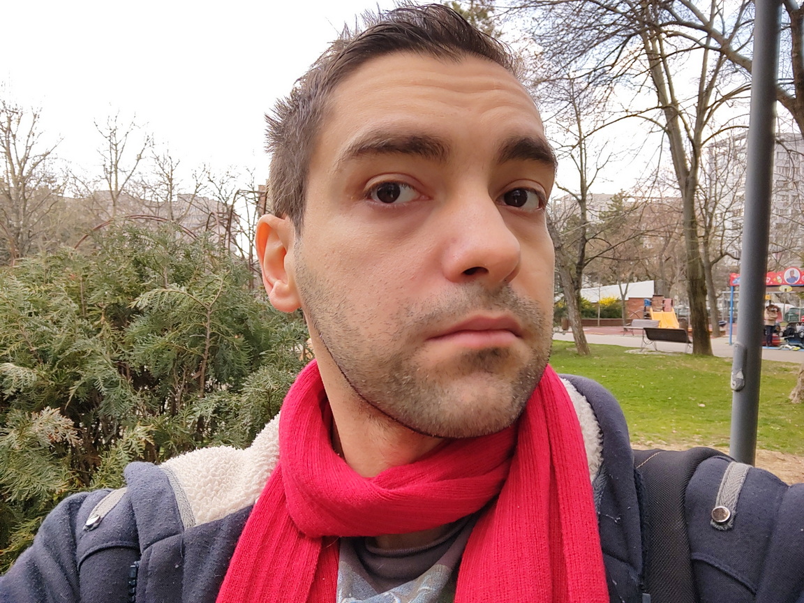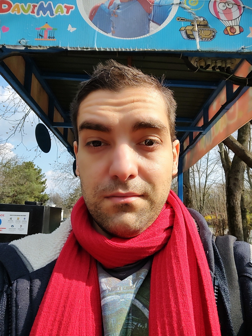 Prima salvă de selfie-uri nu mă impresionează, nu văd detaliile la nivel de porişi fata e că de ceară. Captura ultrawide e binevenită pentru lărgimea de cadru, în care mai înghesui şi peisaj şi priteteni, dar gazonul şi copacii din spatele meu sunt "soft" rău şi lipsite de detalii. Bokeh arata mai clar ridurile de expresie, coşurile, firele de păr, freza proaspăt făcută după tunsoare şi textura fularului sau scamele gecii. Decupare precisă a capului faţă de fundal.