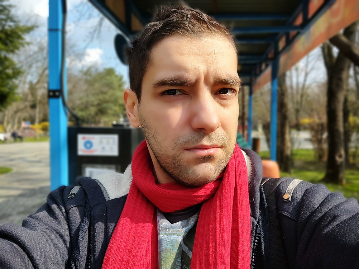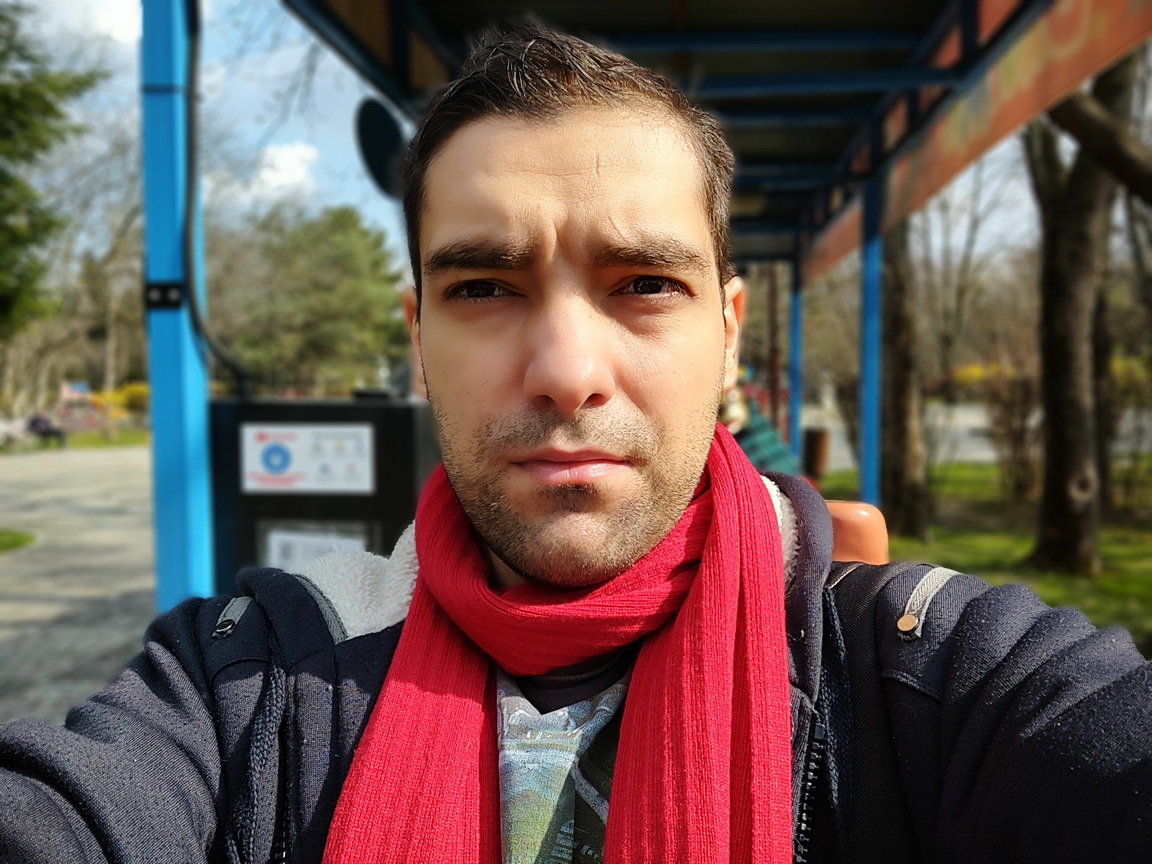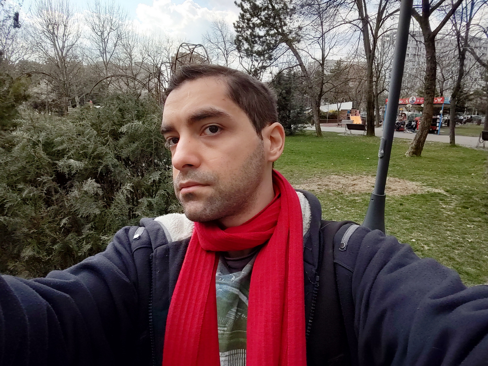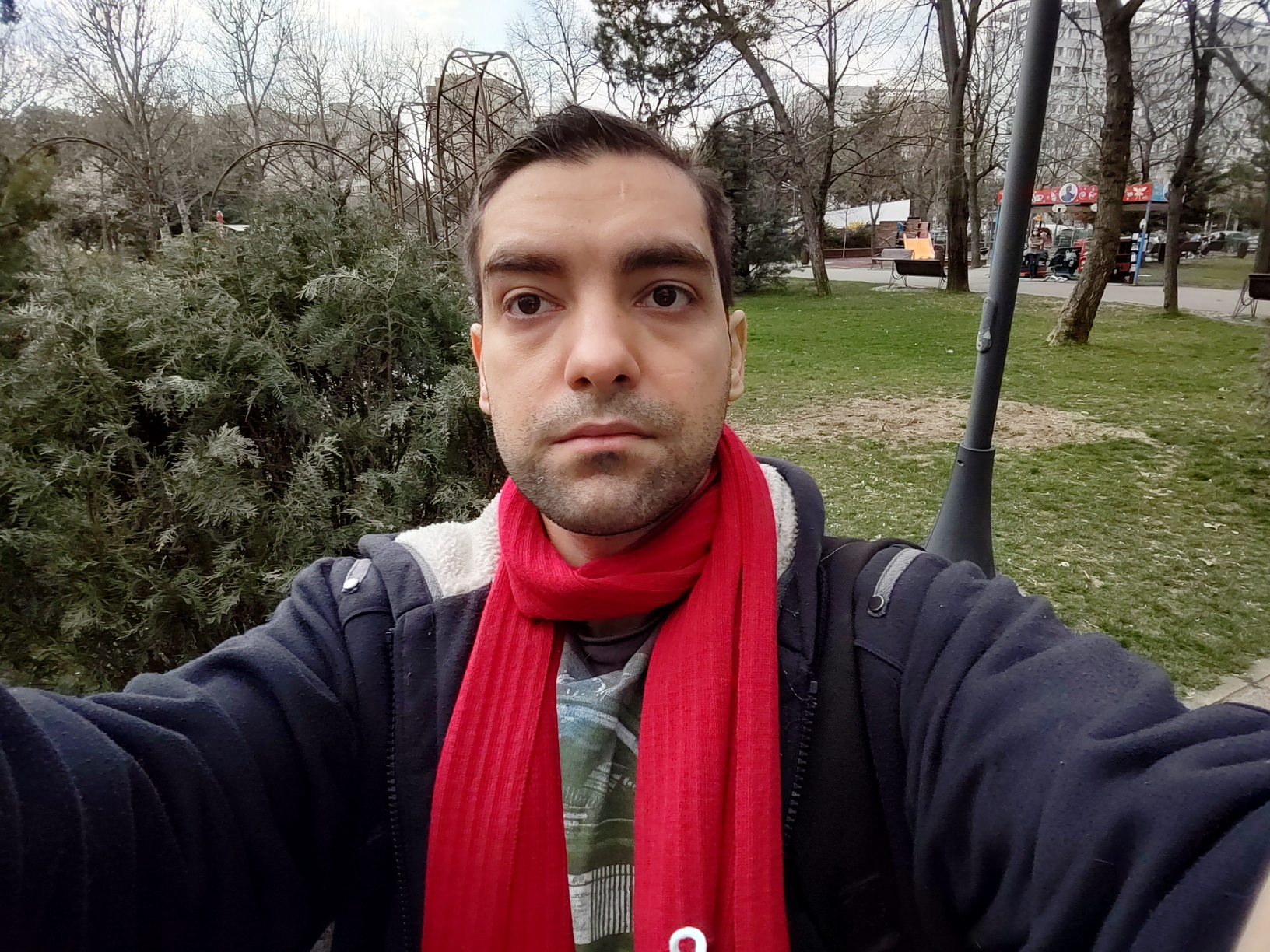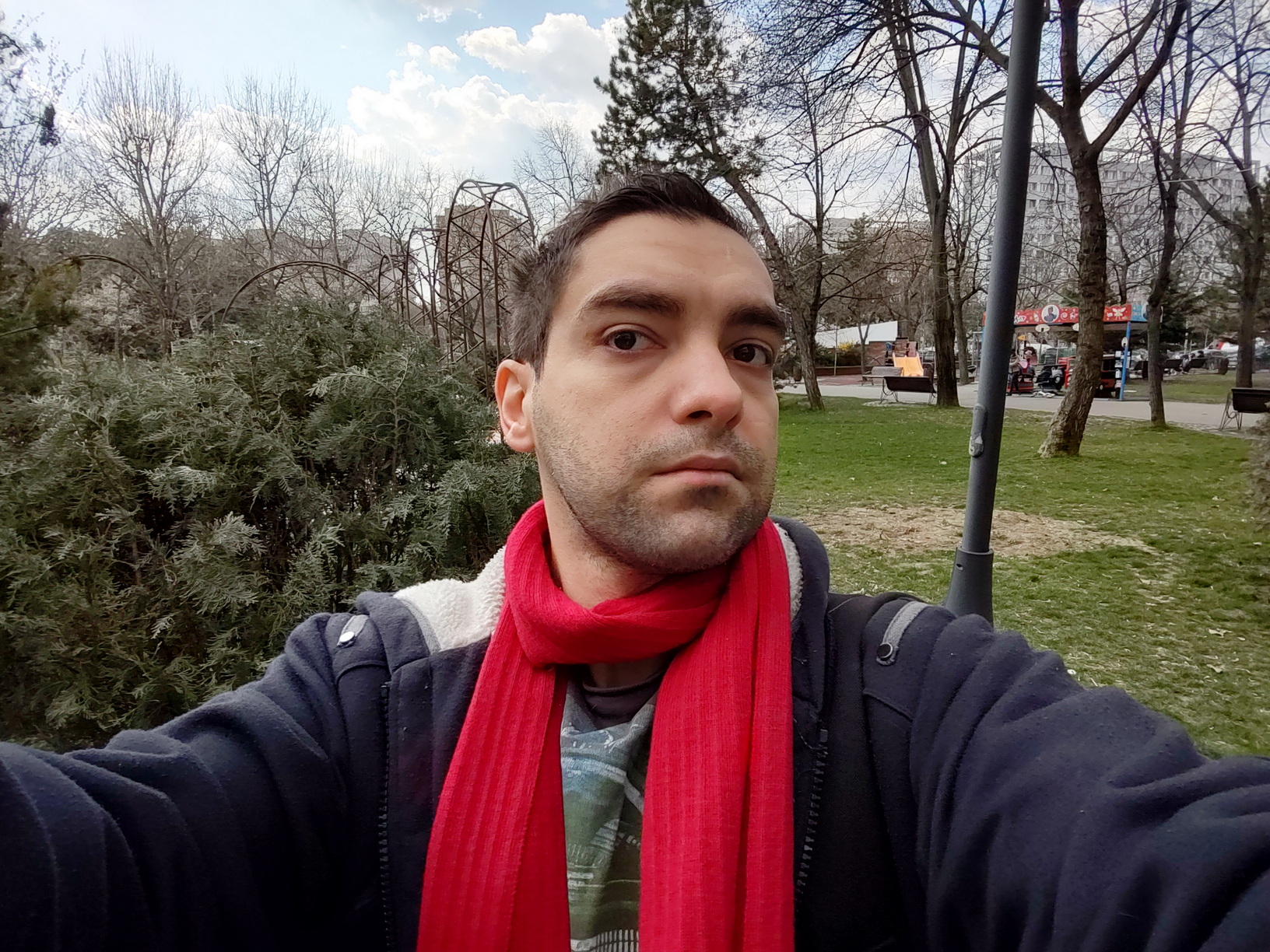 Prima salvă de selfie-uri nu mă impresionează, nu văd detaliile la nivel de porişi fata e că de ceară. Captura ultrawide e binevenită pentru lărgimea de cadru, în care mai înghesui şi peisaj şi priteteni, dar gazonul şi copacii din spatele meu sunt "soft" rău şi lipsite de detalii. Bokeh arata mai clar ridurile de expresie, coşurile, firele de păr, freza proaspăt făcută după tunsoare şi textura fularului sau scamele gecii. Decupare precisă a capului faţă de fundal.