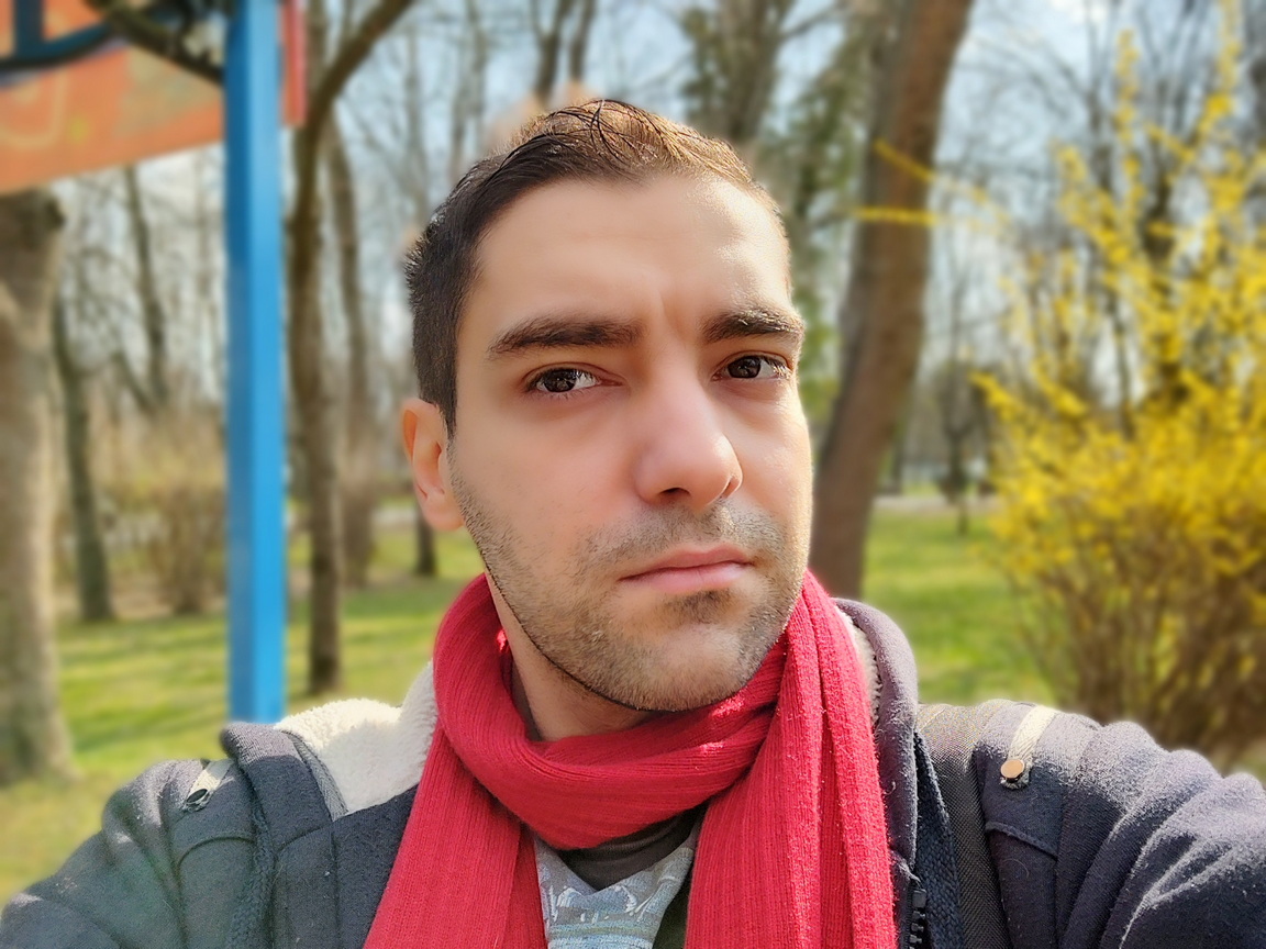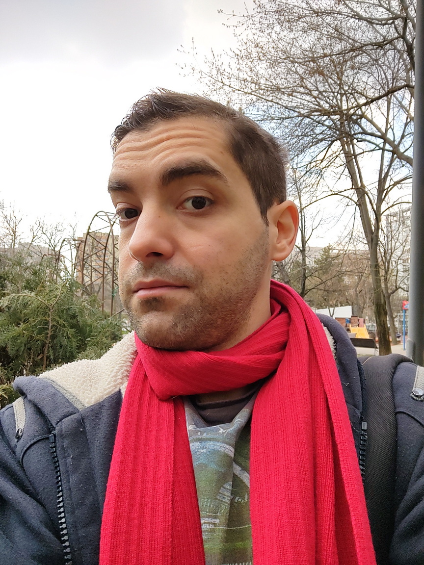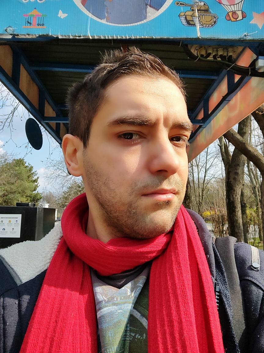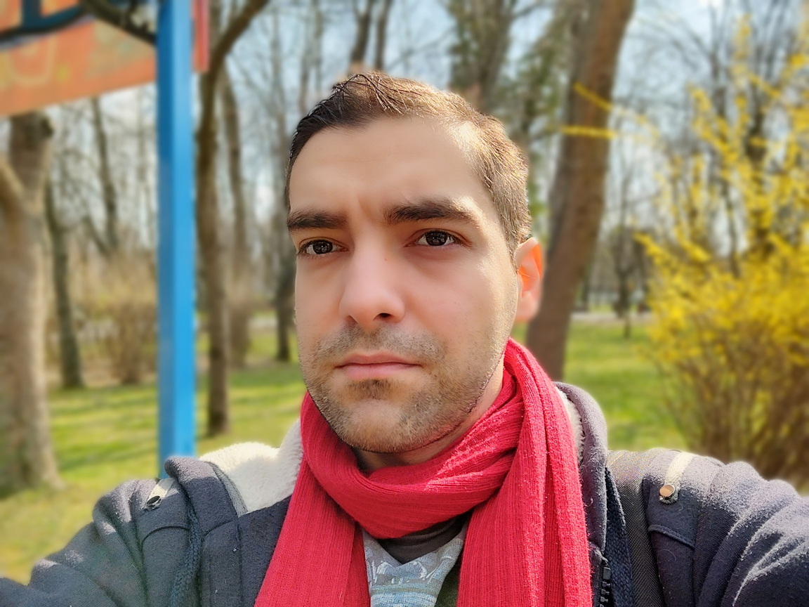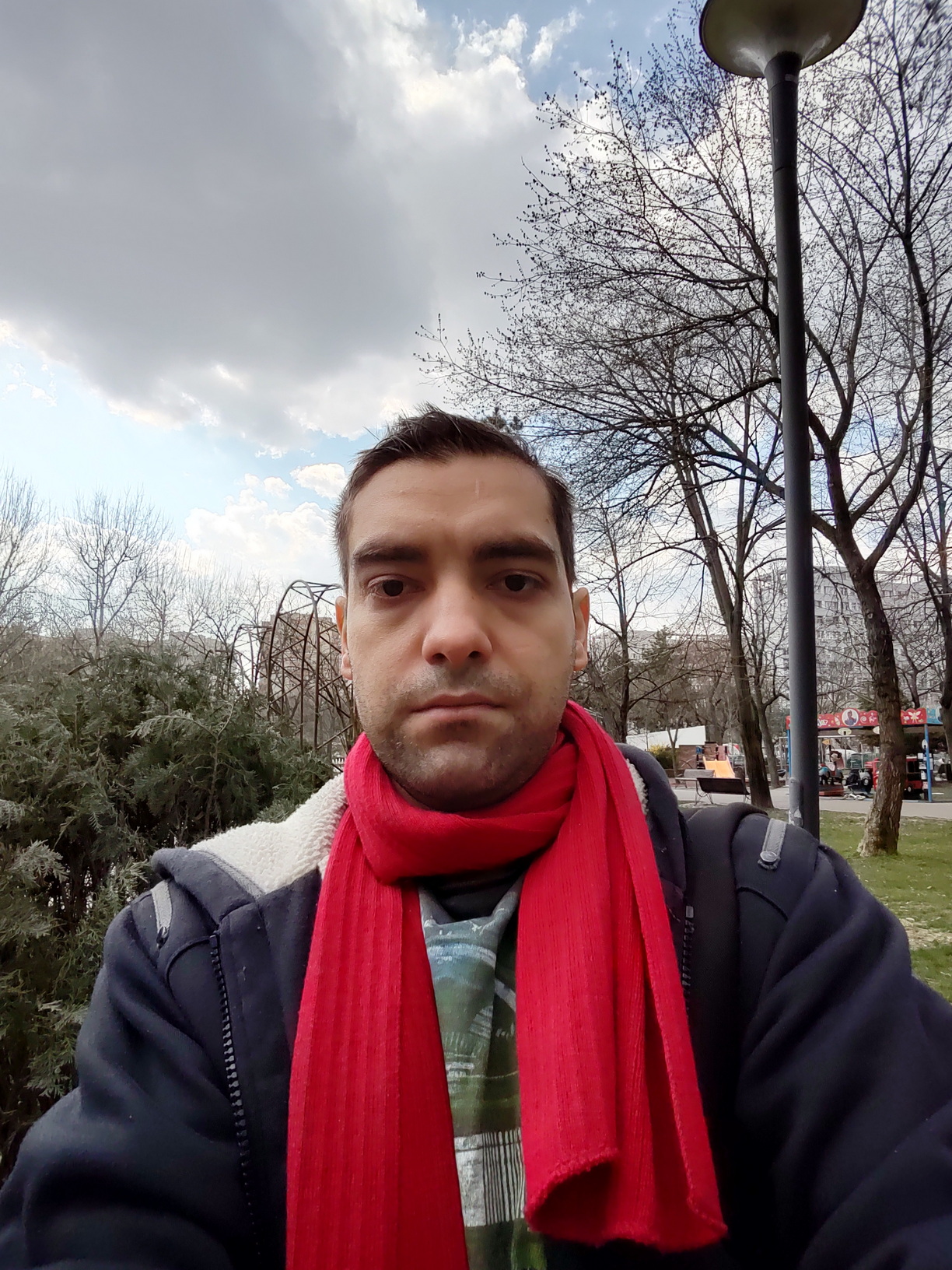 Prima salvă de selfie-uri nu mă impresionează, nu văd detaliile la nivel de porişi fata e că de ceară. Captura ultrawide e binevenită pentru lărgimea de cadru, în care mai înghesui şi peisaj şi priteteni, dar gazonul şi copacii din spatele meu sunt "soft" rău şi lipsite de detalii. Bokeh arata mai clar ridurile de expresie, coşurile, firele de păr, freza proaspăt făcută după tunsoare şi textura fularului sau scamele gecii. Decupare precisă a capului faţă de fundal.