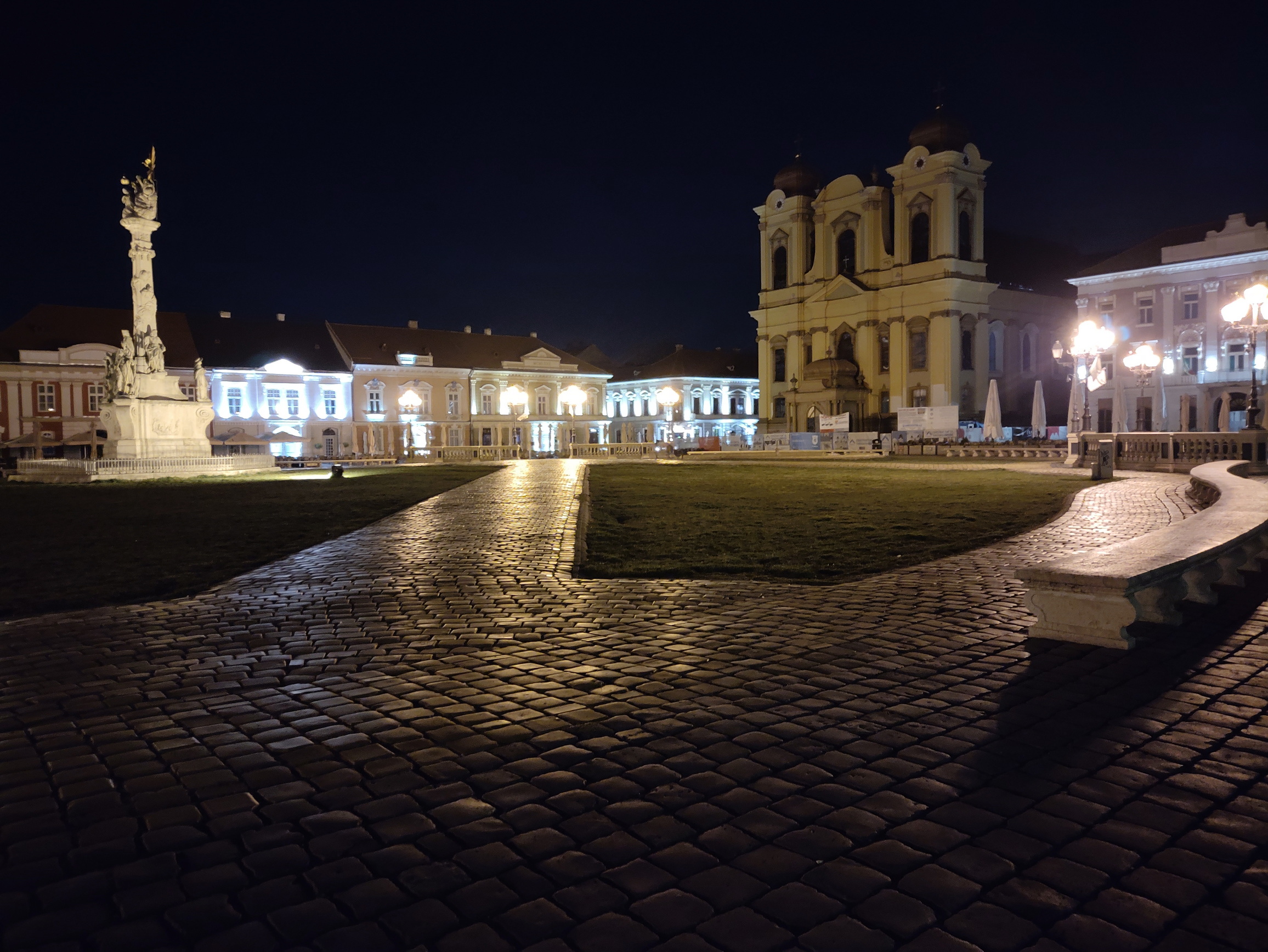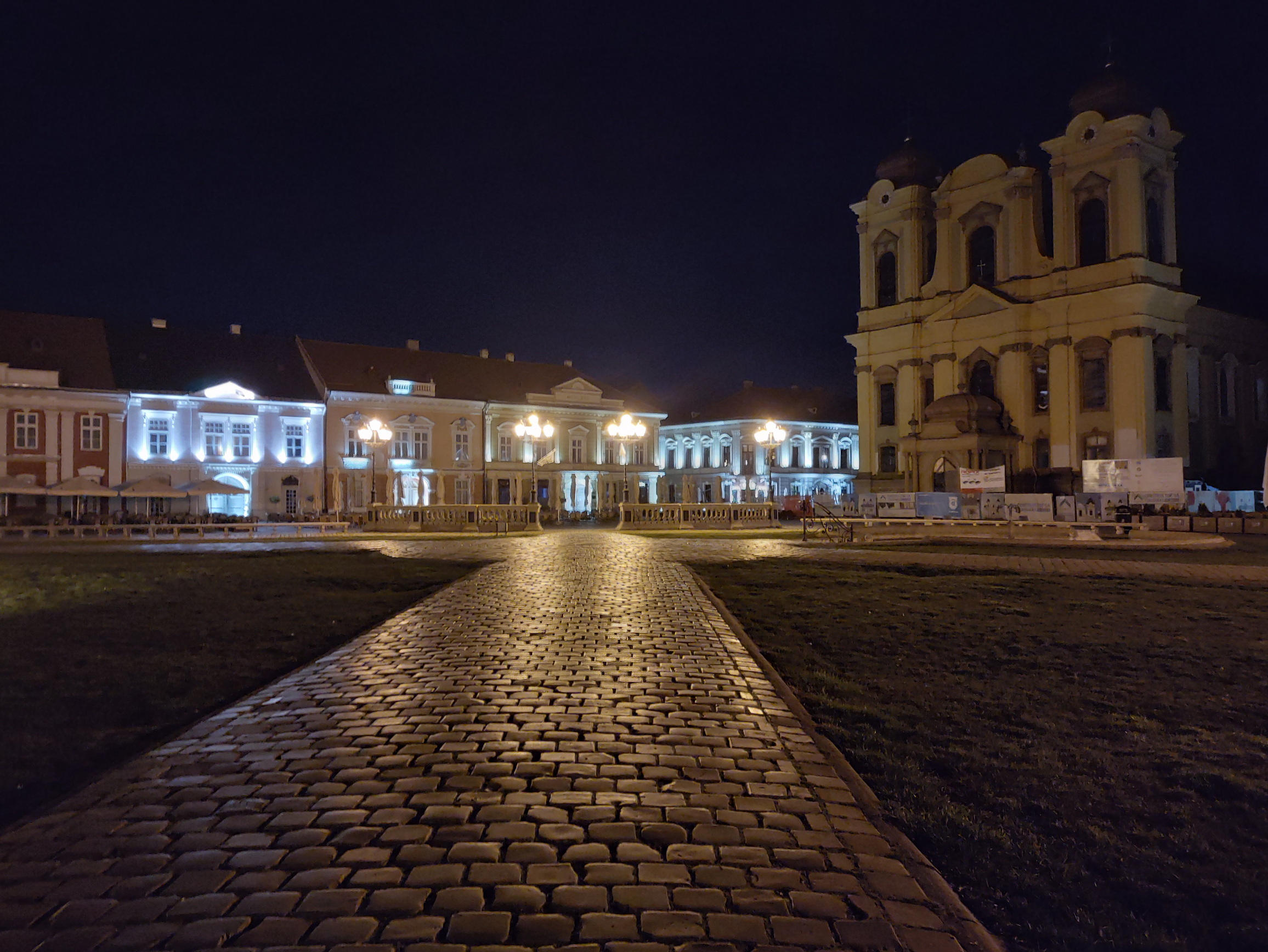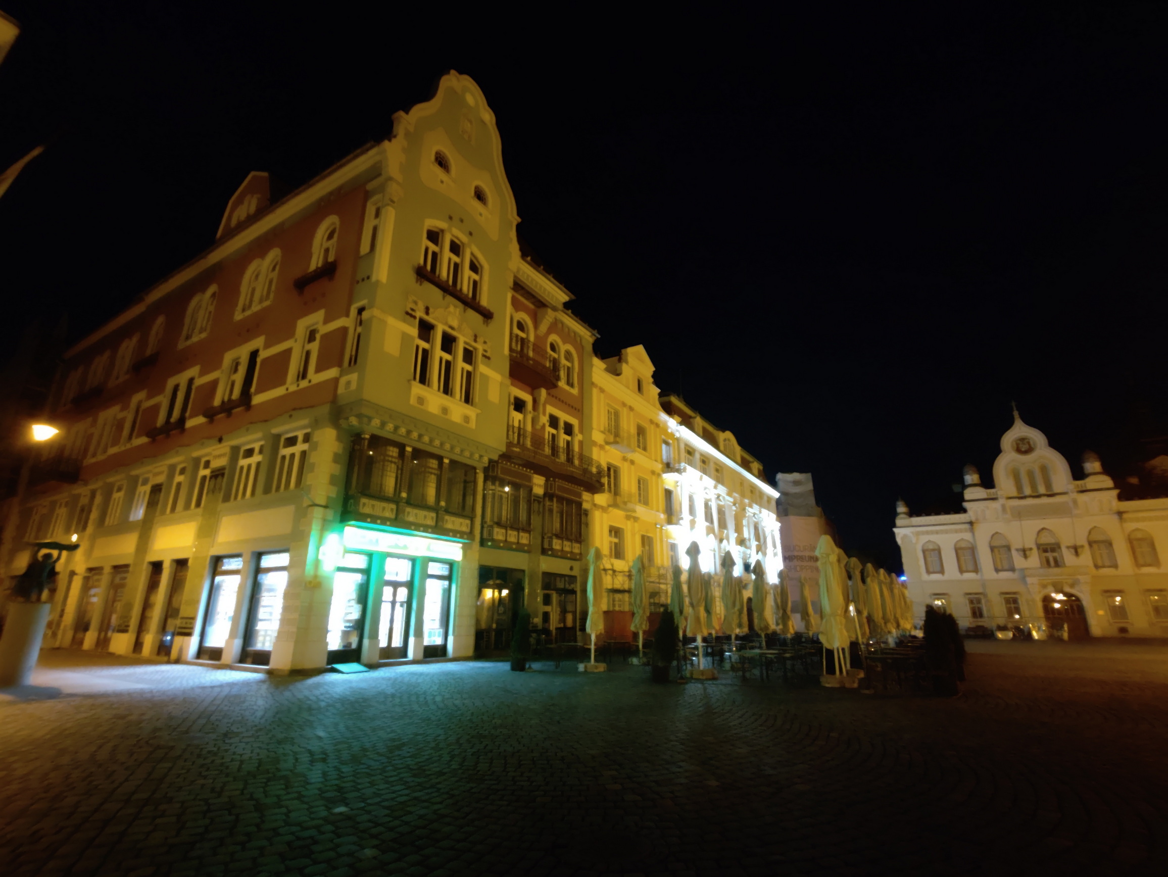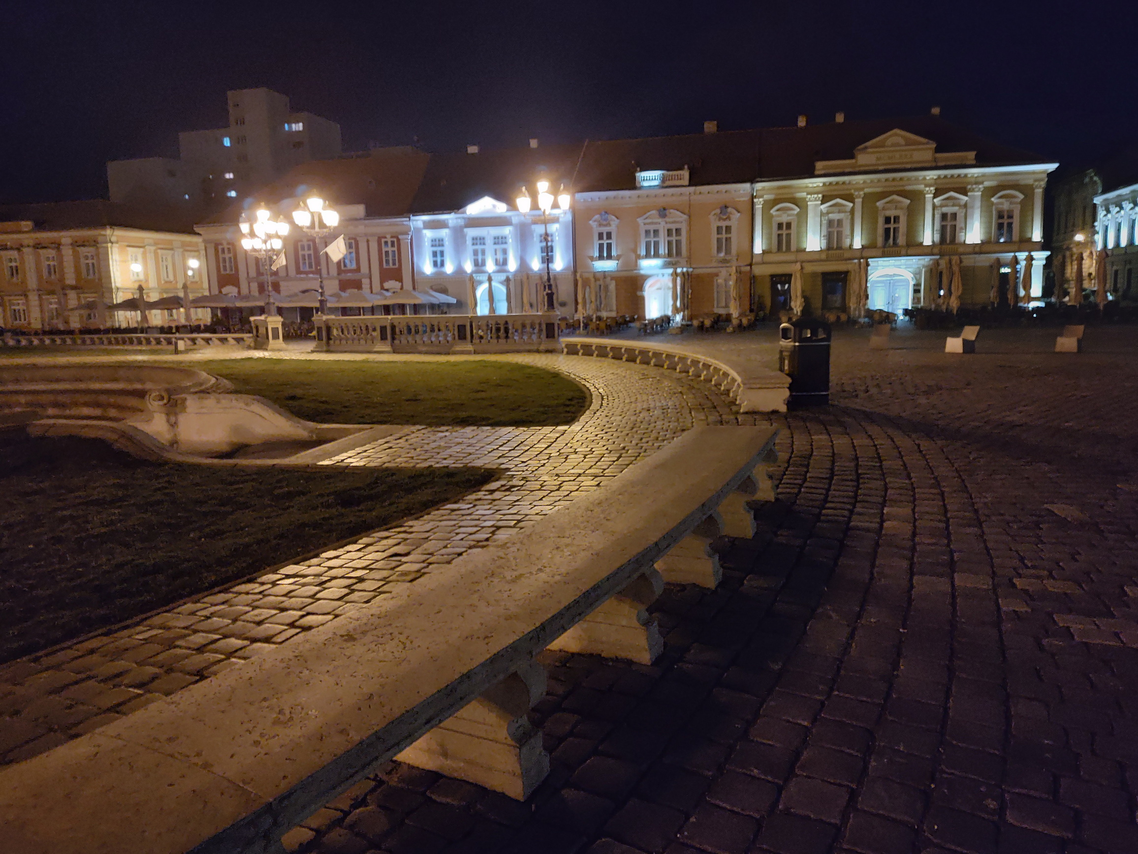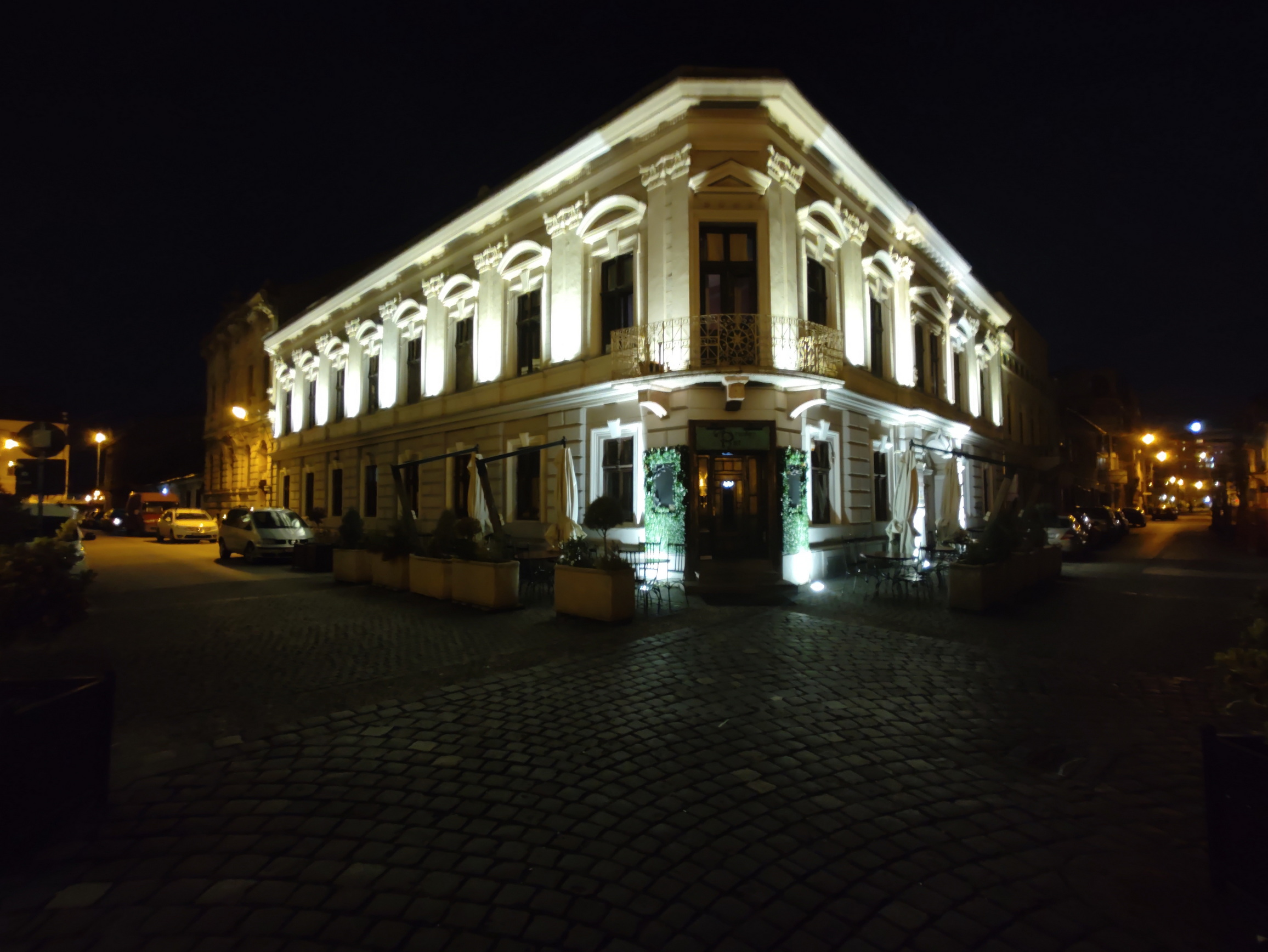 În condiţii low light trecem la Timişoara, pentru o galerie nocturnă în centrul oraşului. Capturile au fost cam întunecate şi gri, uneori roşiatice, portocalii, calde. Felinarele stradale creează dungi de lumină prea mari în jurul lor, mai mari decât ce vedem de obicei. E şi multă neclaritate la captura ultrawide, un soi de blur chiar. Captură cu Night Mode e ceva mai clară, puţin mai bine focalizată, mai clară şi se descurcă mai bine cu sursele de lumină. Totuşi susţin că avem culori mai calde decât de obicei.