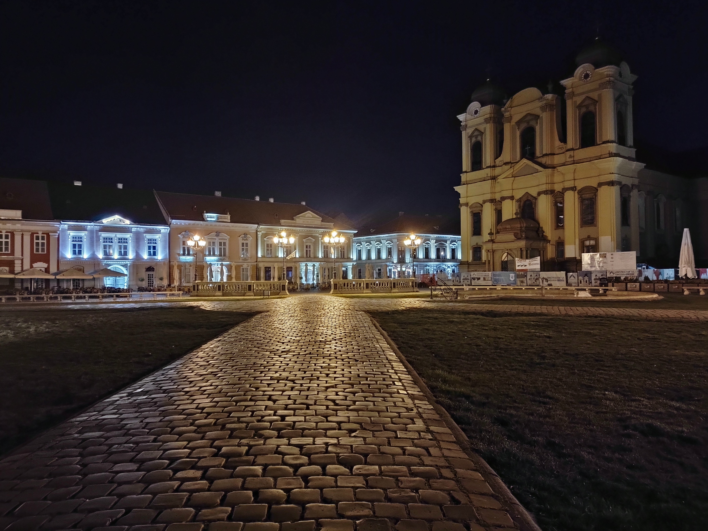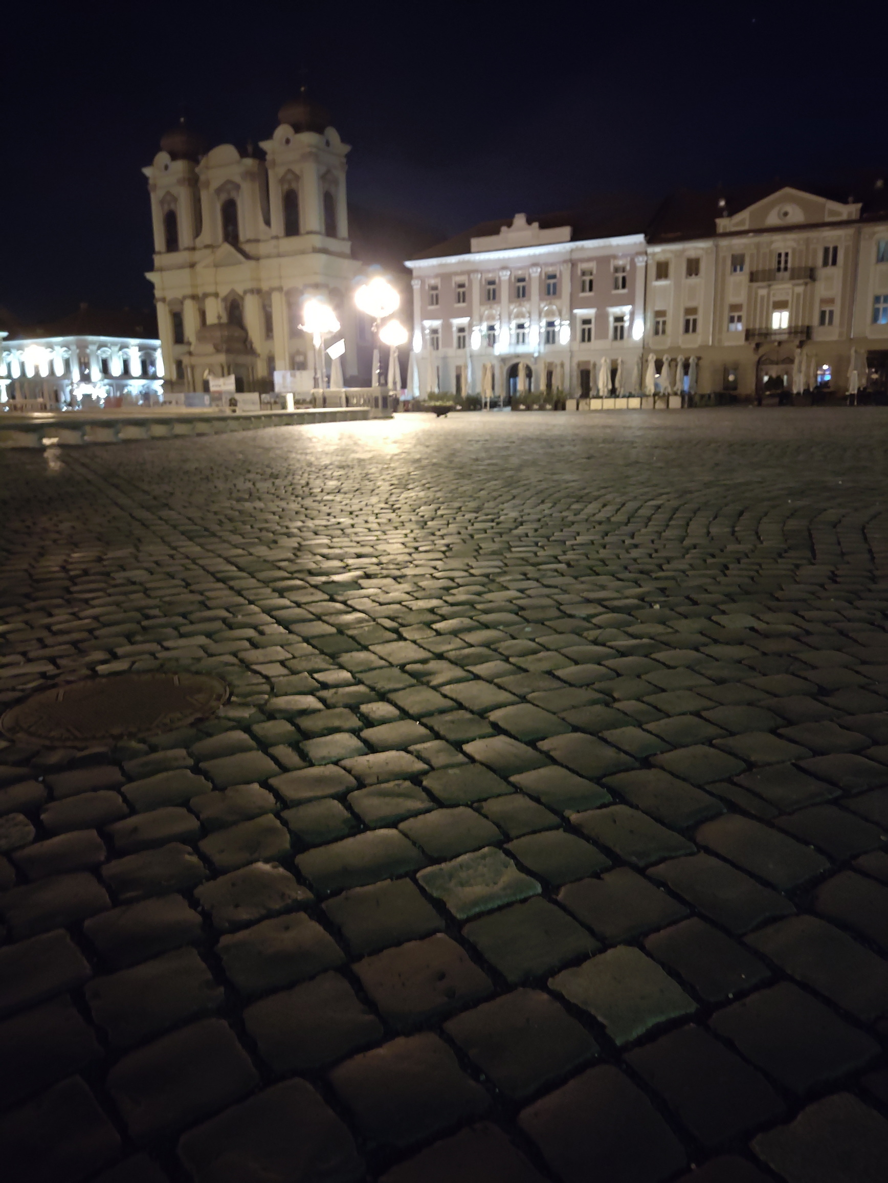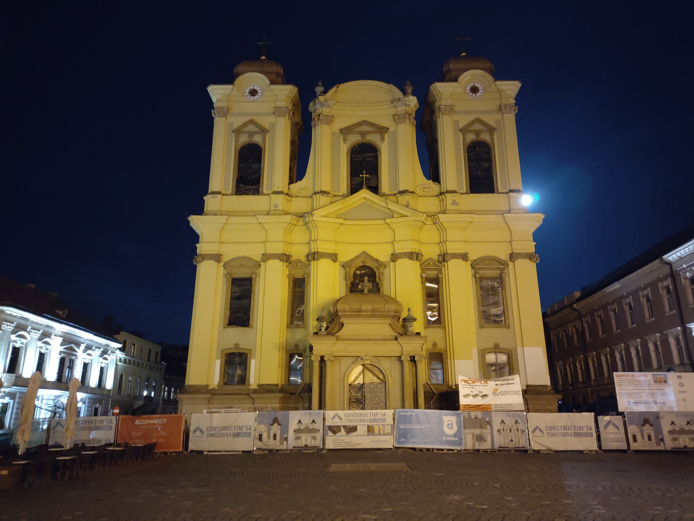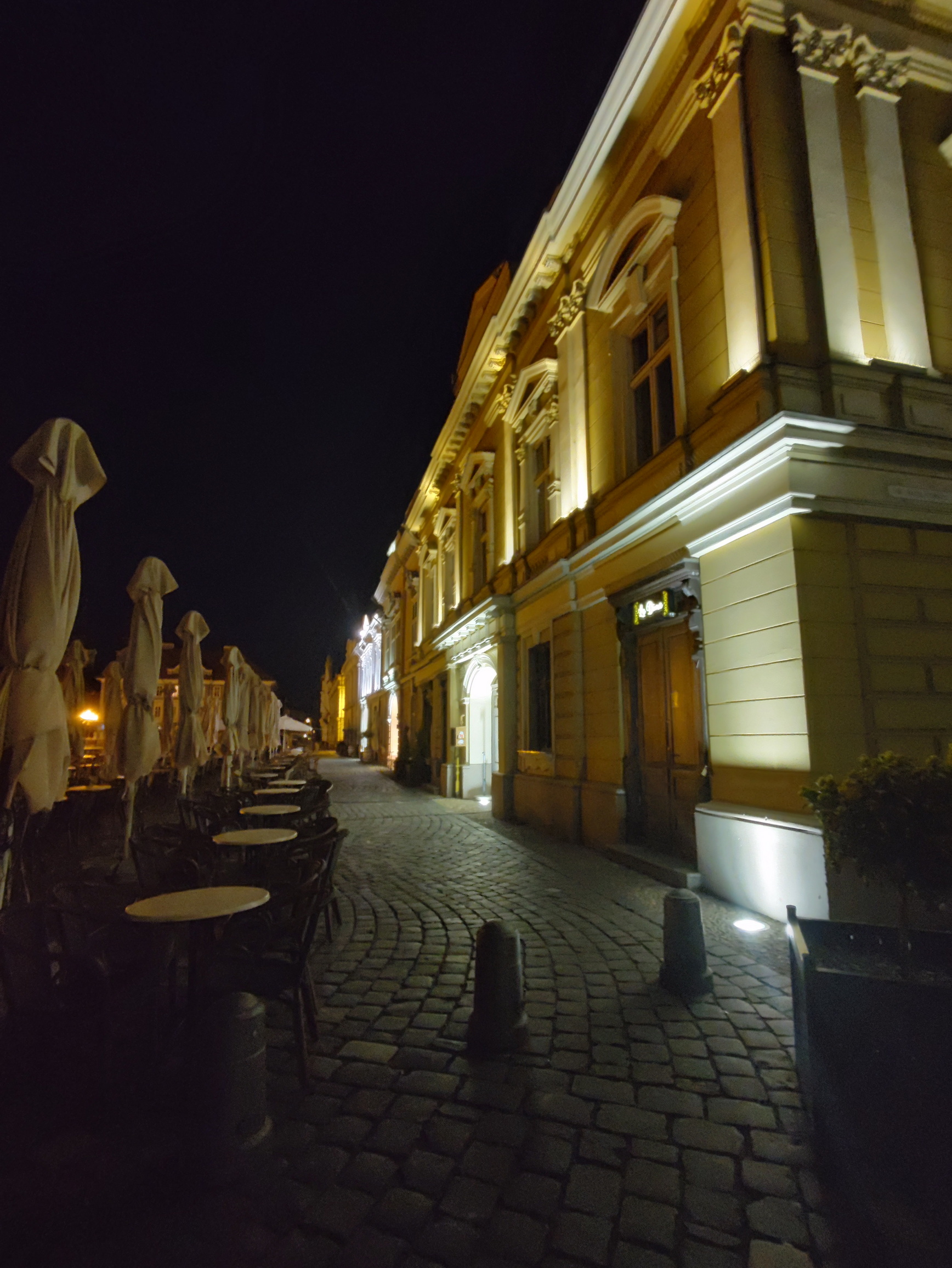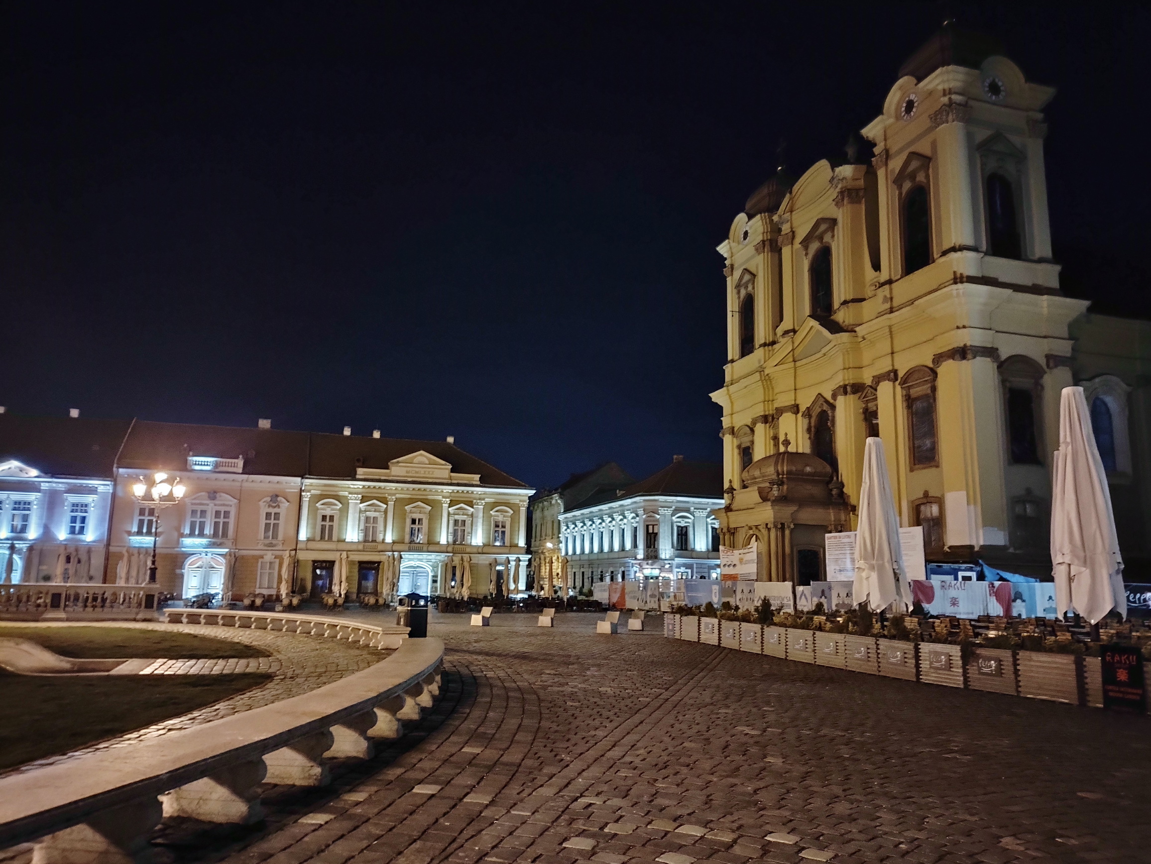 În condiţii low light trecem la Timişoara, pentru o galerie nocturnă în centrul oraşului. Capturile au fost cam întunecate şi gri, uneori roşiatice, portocalii, calde. Felinarele stradale creează dungi de lumină prea mari în jurul lor, mai mari decât ce vedem de obicei. E şi multă neclaritate la captura ultrawide, un soi de blur chiar. Captură cu Night Mode e ceva mai clară, puţin mai bine focalizată, mai clară şi se descurcă mai bine cu sursele de lumină. Totuşi susţin că avem culori mai calde decât de obicei.
