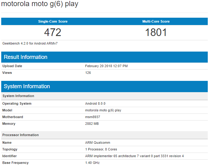 Unul dintre smartphone-urile ce va debuta anul acesta la MWC este și Motorola Moto G6 Play, terminal despre care am tot aflat informații în ultima vreme și care astăzi își face apariția în cadrul testului benchmark GeekBench. Aici sunt reconfirmate dotările sale mid-range reprezentate de către procesorul Qualcomm Snapdragon 430 cu 8 nuclee tactate la 1.4 GHz și de către cei 3 GB RAM de la bord.