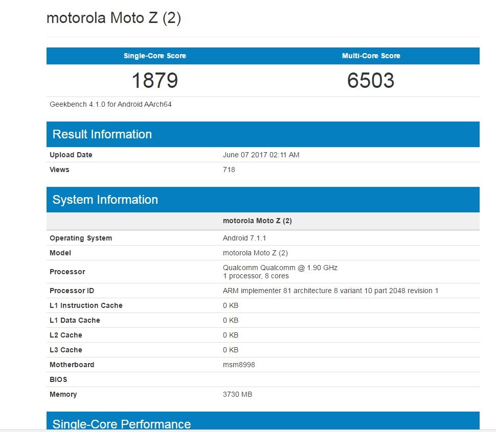 Va fi evident un telefon modular, cu pini în spate pentru ataşarea acestor module. Cât despre apariţia în GeekBench, smartphone-ul vine cu procesor Snapragon 835, 4 GB RAM , dar şi rulând Android 7.1.1 Nougat. Zvonurile afirmă că vom avea o cameră duală în spatele acestui terminal, fiind de altfel o premieră pentru Motorola. De remarcat că Moto Z2 Play a venit cu o cameră singulară în spate.