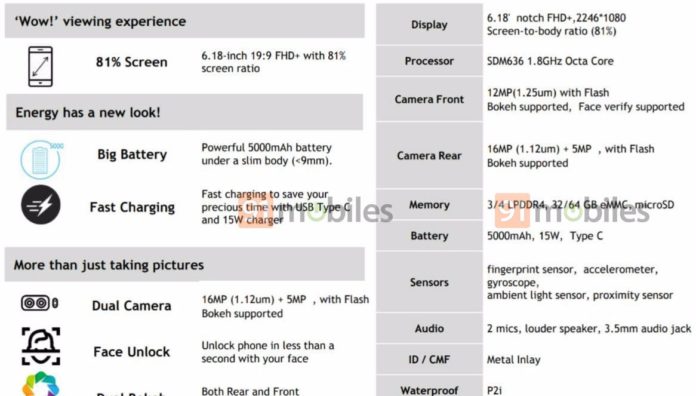 Se va opta pentru un procesor octa-core Qualcomm Snapdragon 636, pentru 3 sau 4 GB RAM și pentru 32 sau 64 GB de stocare flash la bord. Va exista și un slot microSD, scanner de amprente, certificare pentru rezistența la stropire cu apă, o funcție Face Unlock și o cameră foto principală de 16 + 5 megapixeli cu implementări ale AI-ului. În zona de captură selfie se va afla un senzor de 12 mpx.