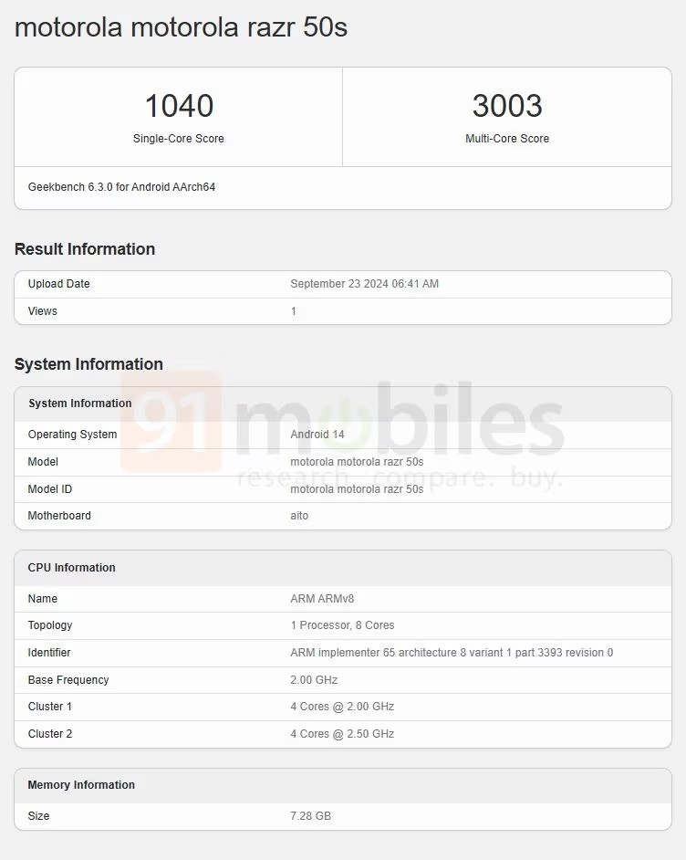 Smartphone-ul apare aici pe gri, bej și portocaliu, iar la prima vedere ai zice că este direct Motorola RAZR 50, doar că îl dă de gol inscripția text de pe ecran "razr 50s". Avem și o listare din GeekBench în care telefonul obține 1040 puncte single-core și 3003 puncte multi-core, scor foarte apropiat de ce am obținut noi cu RAZR 50 (1055/3043 puncte).