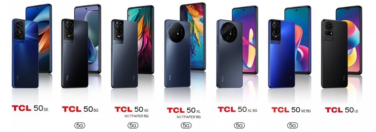 TCL 50 XL ar fi un model reprezentativ în serie. El primește panou de 6.8 inch IPS LCD cu rezoluție Full HD+ și refresh rate de 120Hz. Apare apoi un TCL XE 5G care primește panou de 6.6 inch cu rezoluție HD+ și refresh rate de 90Hz. Ambele au până la 8 GB RAM, baterii de 5010 mAh, 128 GB de stocare, difuzoare stereo și CPU-uri MediaTek de buget sub capotă.