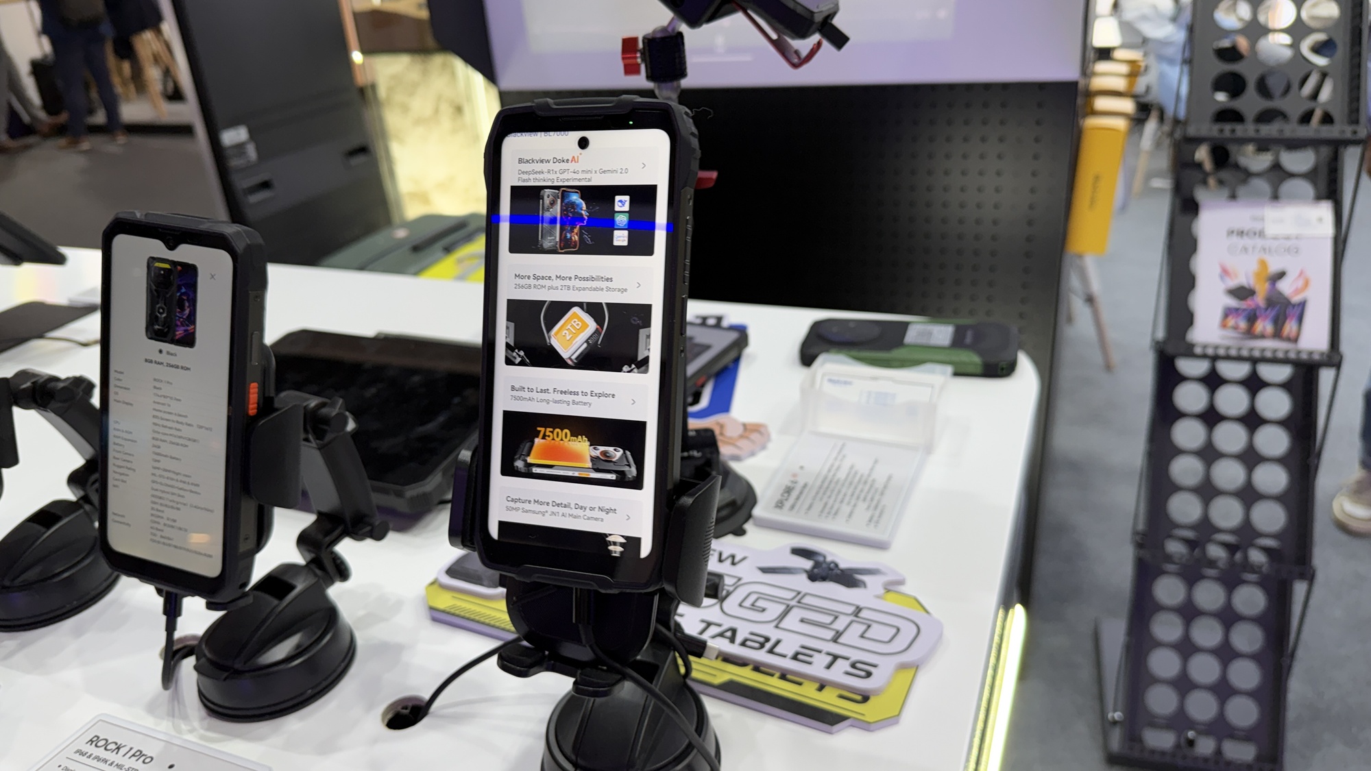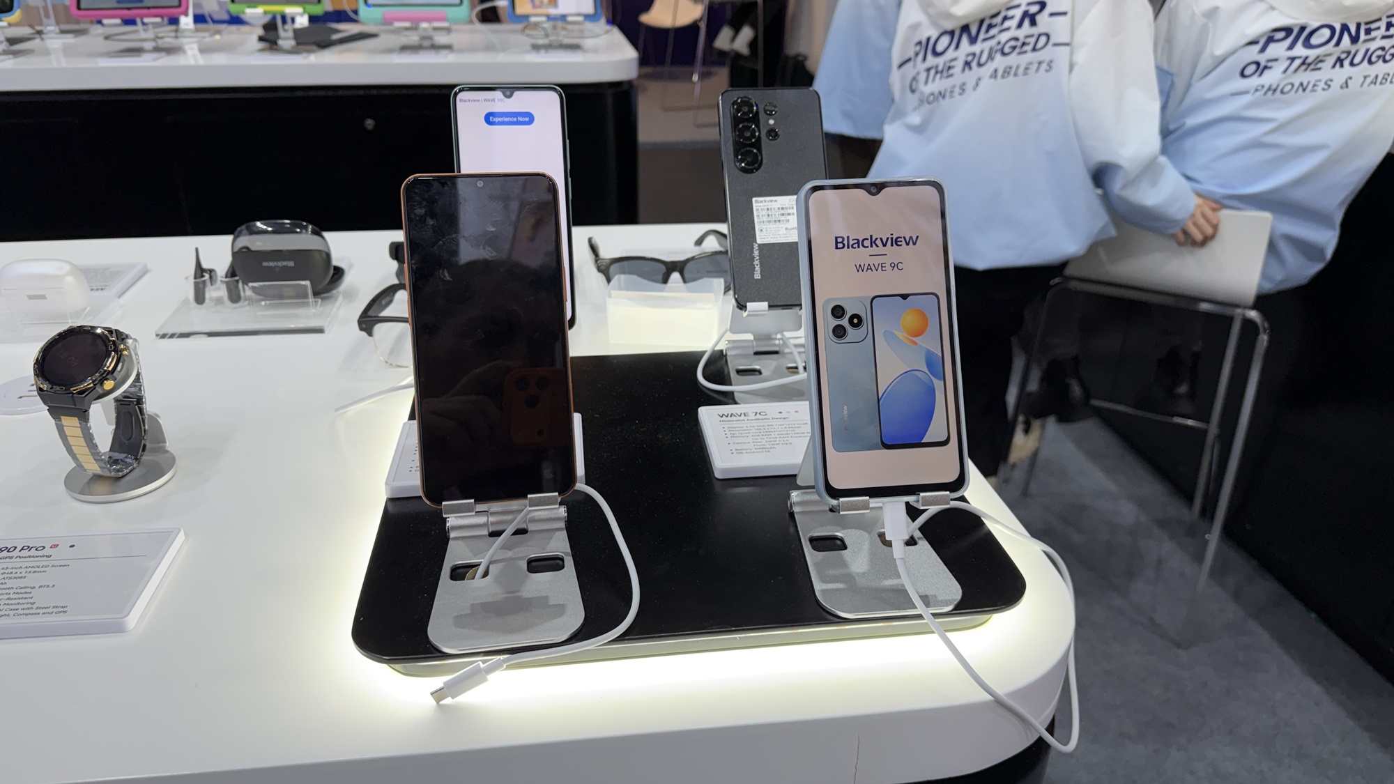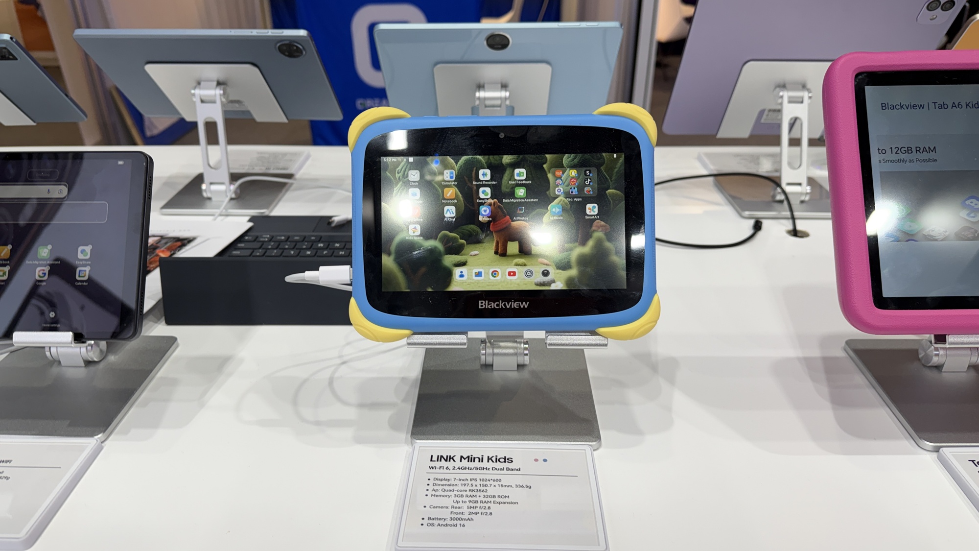 Până să vedem telefoane robuste, am văzut un laptop cu două ecrane laterale, care se ataşează printr-un soi de kickstand. Blackview face şi ochelari, care au speakere pentru a asculta muzică, dar şi căşti în stil Huawei FreeClip. Văd şi unele over-ear în stil Skullcandy. Sunt şi multe tablete pentru copii, extra protejate şi cu softuri de bază, pentru citit, desenat şi făcut lecţii. Preţ mic, dar şi doar 3 GB RAM.