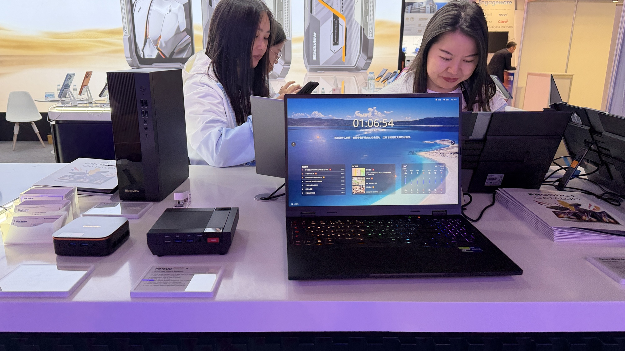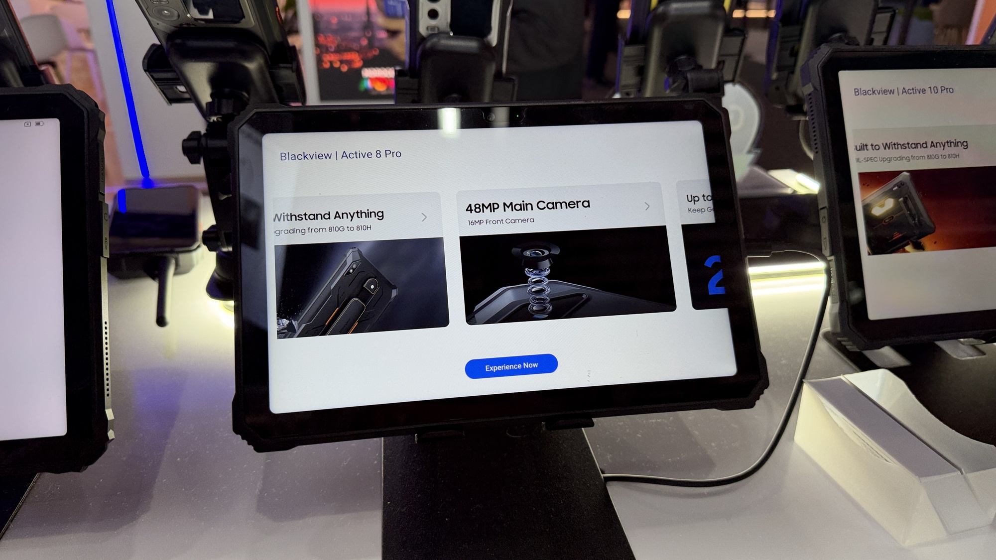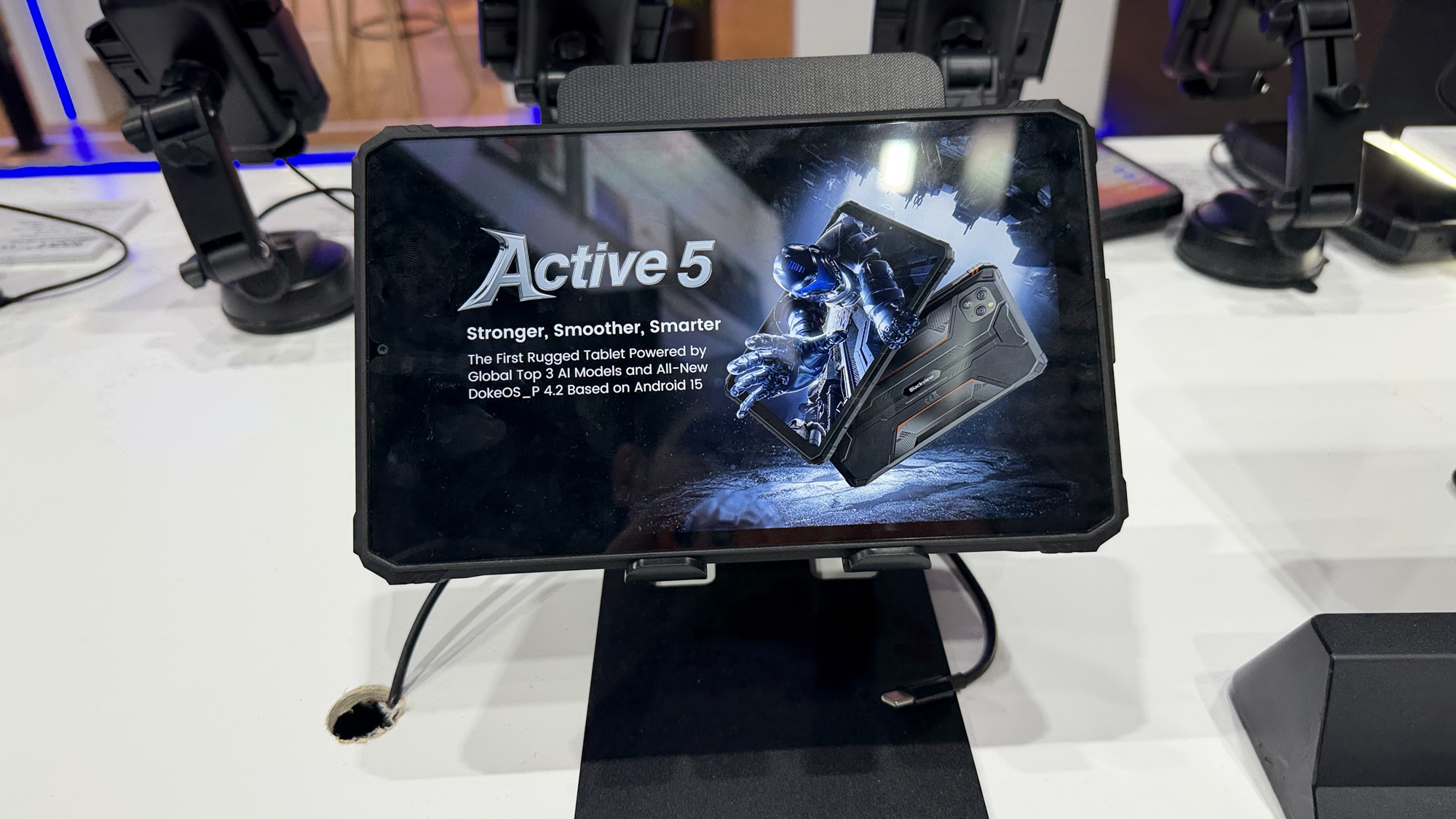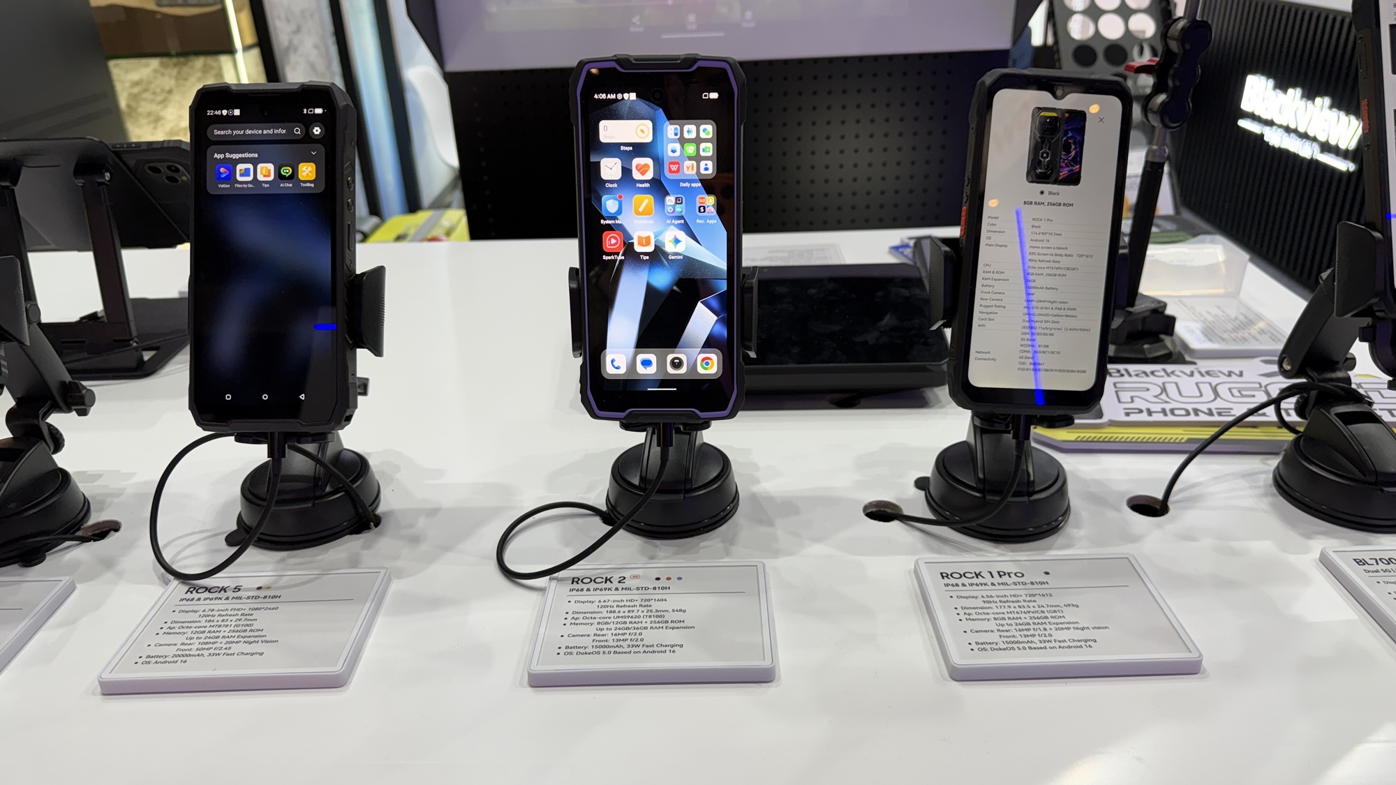 Până să vedem telefoane robuste, am văzut un laptop cu două ecrane laterale, care se ataşează printr-un soi de kickstand. Blackview face şi ochelari, care au speakere pentru a asculta muzică, dar şi căşti în stil Huawei FreeClip. Văd şi unele over-ear în stil Skullcandy. Sunt şi multe tablete pentru copii, extra protejate şi cu softuri de bază, pentru citit, desenat şi făcut lecţii. Preţ mic, dar şi doar 3 GB RAM.