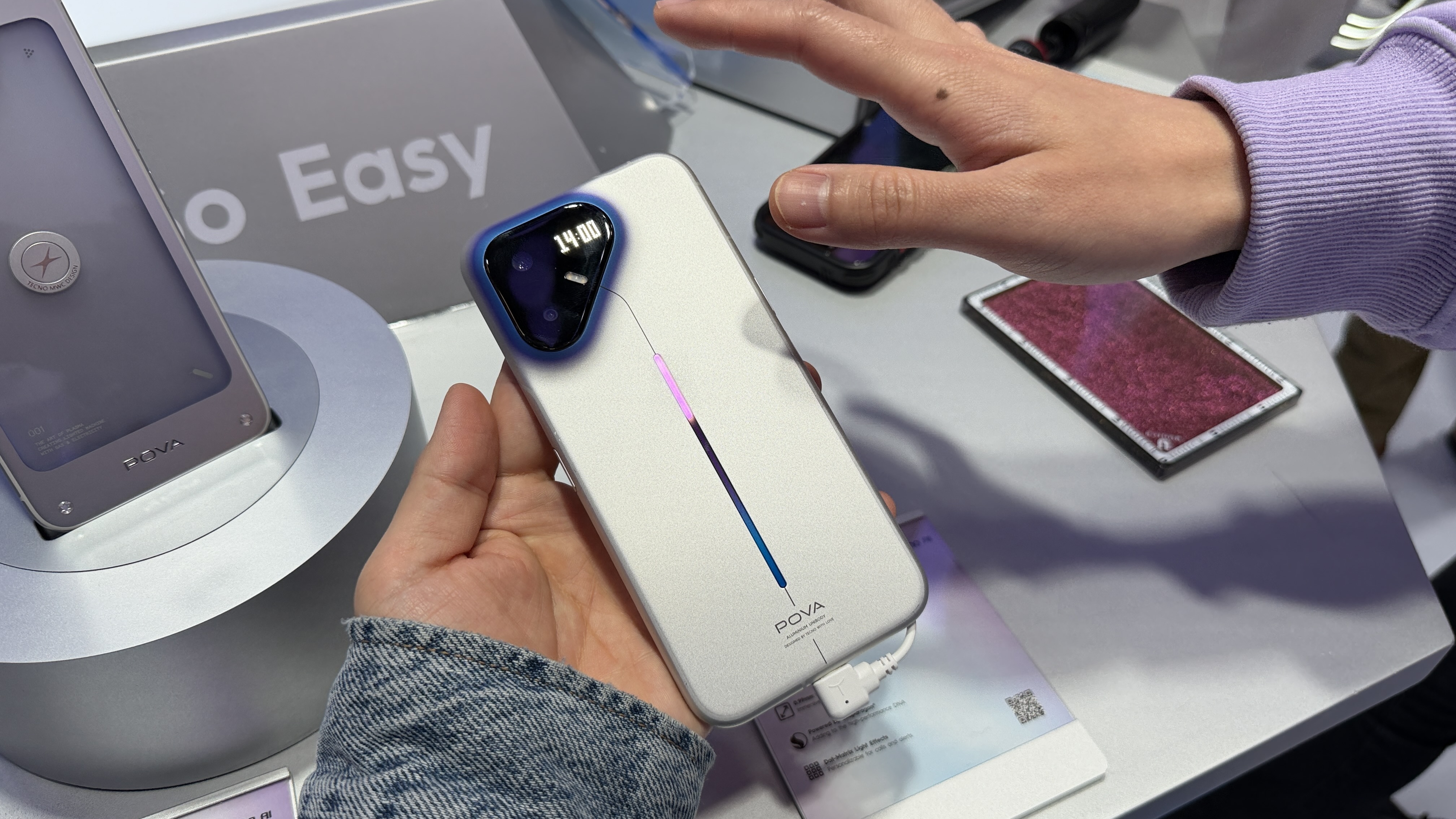 La standul lor de la MWC 2026 era expus modelul Tecno Pova Metal, care avea și o ediție specială Tonino Lamborghini, pe roșu. Este promovat ca fiind primul telefon 5G din lume cu o carcasă complet din metal de tip unibody. Întreg corpul dispozitivului, inclusiv zona modulului foto, este realizat din metal, oferind o senzație premium și robustă, rară pentru smartphone-urile moderne.