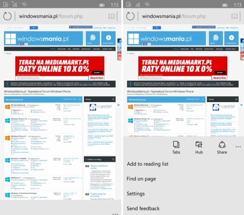 Aceste capturi au fost realizate pe terminale mobile, ce rulau Windows 10 în versiunea pentru handseturi. Cei de la WindowsMania.pl au pus mâna pe imagini, care ne prezintă o interfaţă foarte aerisita şi curată. Se merge foarte mult pe gri şi negru din ce vedem şi există şi un Reading List oferit. Avem şi posibilitatea de a partaja o pagină, iar de departe cea mai mare modificare este mutarea barei de adrese sus.