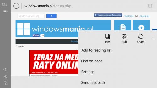 Până acum pe Windows Phone, IE for mobile integra bară de adrese jos. Vedem şi o secţiune numită Hub listata aici, probabil locul unde putem găsi articolele pentru citit offline. Există şi o funcţie de predicţie pentru momentul în care vom accesa pagina următoare, care are rolul de a accelera browsingul prin "Flip Ahead". Cum vi se pare noul browser?
