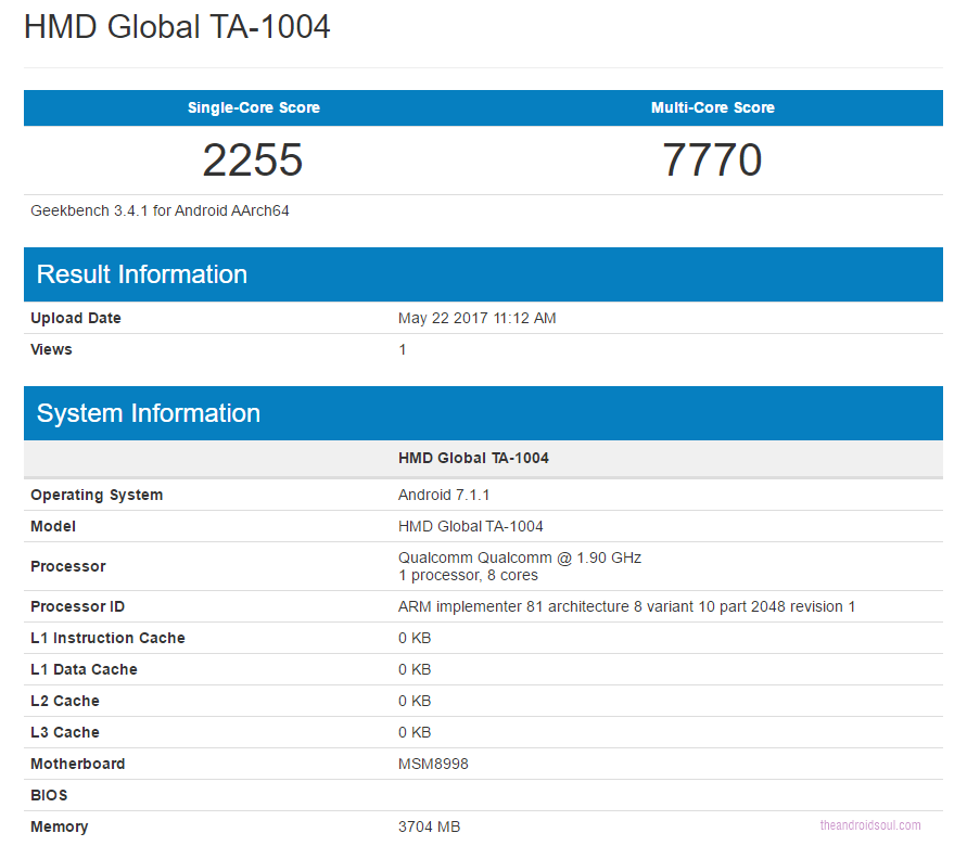 E vorba despre GeekBench, iar terminalul este listat drept HMD Global TA-1004. Apare cu procesorul Snapdragon 835 şi 4 GB RAM, exact cum ne aşteptam, iar ca OS avem Android 7.1.1. Obţine 2255 puncte în testul single-core şi 7770 în cel multi-core. Având în vedere că o scăpare recentă a lui OnePlus 5 indică scoruri de 1963/6687 puncte în aceleaşi test, putem spune că Nokia 9 stă foarte bine, depăşind noul flagship OnePlus.