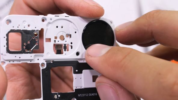 Acum ajungem la partea de disecție. Accesul la panoul din spate e un pic mai complicat. Sticla e lipită și trebuie desprinsă cu grijă. Odată ajuns acolo, lucrurile merg surprinzător de lin. Inelele camerelor sunt bine fixate, iar interfața Glyph Matrix se dezvăluie treptat, odată ce Zack ajunge la placa de bază. Aici vedem și cum butonul capacitiv „Essential Key” e conectat direct la placa de încărcare.
