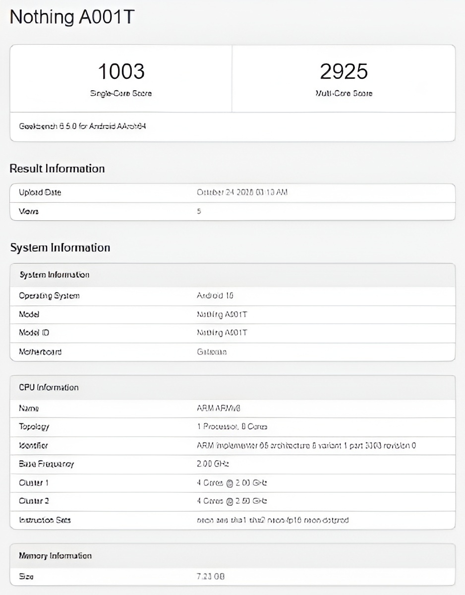 Smartphone-ul apare în această listare cu numele de cod „A001T”. Comparând specificațiile cu leak-urile ajunse pe web în trecut, ne dăm seama că e vorba despre așa-zisul Nothing Phone (3a) Lite. Rulează Android 15 și e echipat cu procesorul Dimensity 7300 de la MediaTek. Varianta testată are 8 GB de memorie RAM și obține 1003 puncte în single-core, respectiv 2925 puncte în testul multi-core.