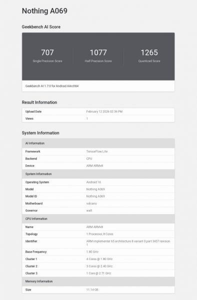 Nothing Phone (4a) a fost listat în Geekbench AI recent. După ce am aflat configurațiile noilor modele din seria cu același nume, varianta de bază are CPU-ul confirmat. Pare să fie vorba despre Snapdragon 7s Gen 4. Ce alte informații aflăm pe baza listării?
