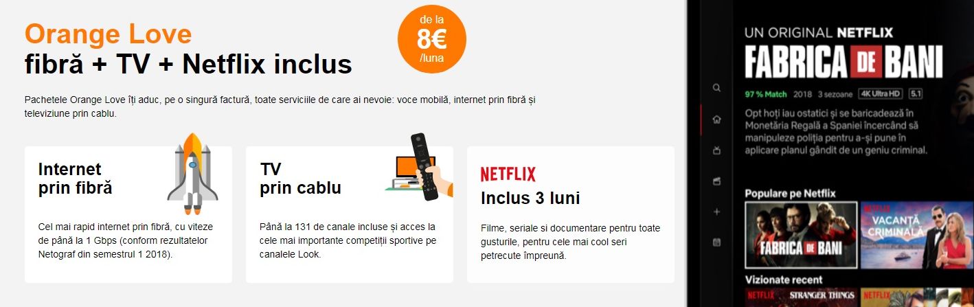 Clientii Orange pot alege pachetele de servicii convergente Orange Love, care aduc atât Internet fix de mare viteză (1 Gbps), dar şi 131 de canale TV şi acces timp de 3 luni la pachetul standard Netflix. Preţurile pornesc de la 8 euro pe lună, iar oferta este disponibilă până pe 31 octombrie 2019. Puteţi adăuga şi un abonament de voce, care începe de la 8 euro pe lună, ducând pachetul complet de servicii la doar 16 euro pe lună.