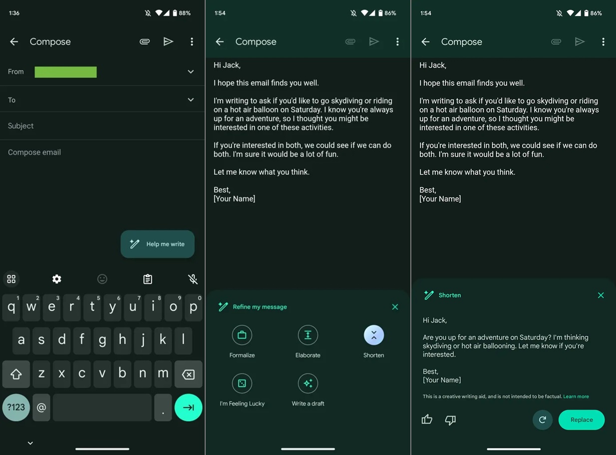 Help Me Write este un tool AI disponibil pentru cei care fac parte din programul Workspace Labs. Prima dată a fost descoperit de publicația 9To5Google și funcționa în varianta web a Gmail. Acum pare că Google a adus funcționalitățile AI-ului în aplicația Gmail pentru Android și iOS. După cum vedem în screenshot, apare opțiunea „Help Me Write”, iar opțiunile sale te ajută să formatezi textul scris, să îl scurtezi, dar există și opțiunea „I’m Feeling Lucky / Mă simt norocos”.