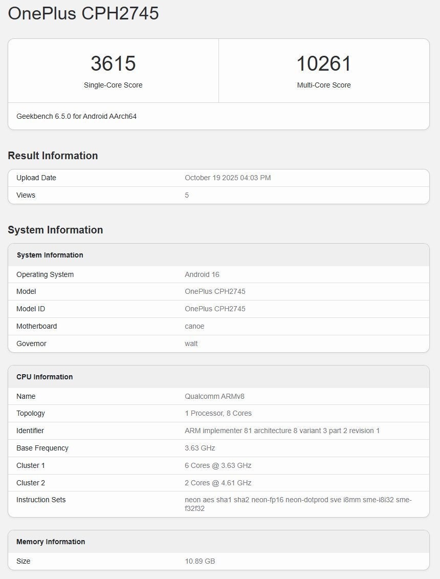 Modelul cu numărul CPH2745 a obținut scoruri solide: 3615 în single-core și 10.261 în multi-core, fiind alimentat de procesorul Snapdragon 8 Elite Gen 5. Zvonurile indică un pachet serios: ecran OLED BOE X3 de 6.78 inch în diagonală, baterie de 7300 mAh (sperăm să fie valabilă în Europa) și încărcare rapidă la 120W pe fir, respectiv 50W în regim wireless.
