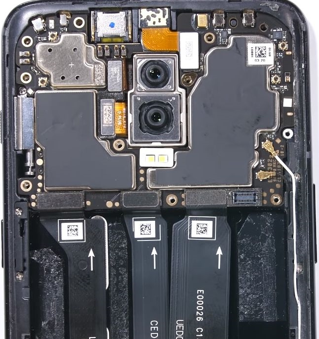Vedem şi cum arată butonul Mute cu cele 3 stagii ale sale de acţionare (Silent, Vibrate şi Ring). SIM tray-ul se află în dreapta şi nu există vreun slot microSD. Nici urmă de pastă termică sau heatpipe pe acest telefon, din câte am văzut. Camera principală vine cu mecanism OIS în setupul dual din spate, dar cea secundară nu vine cu mecanism de genul. Şuruburile folosite de OnePlus aici sunt clasicele Philips, iar în zona inferioară componentele sunt destul de înghesuite, deci chiar nu era loc pentru jack audio.