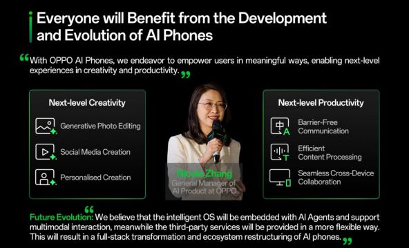 OPPO e cea mai nouă companie care se alătura trendului AI şi promite să aducă AI-ul pe 50 de milioane de terminale până la final de an. OPPO considera şi că telefoanele au devenit cel mai important dispozitiv de tip "personal AI" şi îşi ia în serios misiunea de a "aduce AI-ul maselor".