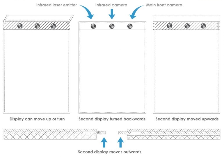 Dacă la modele precum Oppo Find X sau Vivo NEX aveam un mecanism slider pentru camera selfie, în cazul de față ecranul este cel care se transformă în mecanism slider, fiind cu adevărat un design unic. Pe seama descrierii brevetului și a schiței pe care o vedem mai sus, aflăm că există la mijloc un ecran secundar retractabil ce se va putea ridica și plia ulterior în spate.