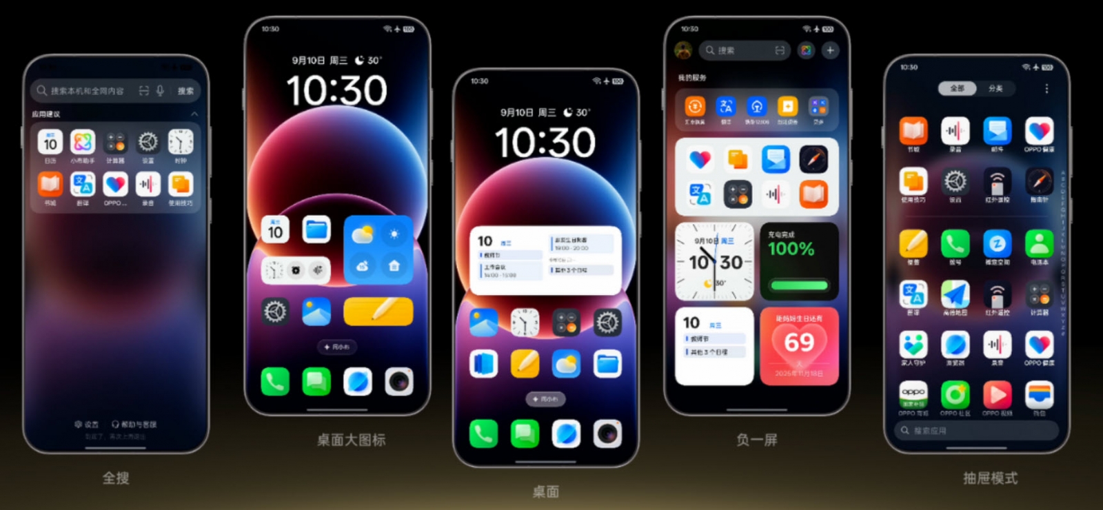 OPPO afirmă că aplicaţiile pornesc cu 28% mai rapid, timpul de încărcare scade cu 21%, iar solicitarea procesorului se reduce cu 14%. Ca design inspiraţia iconografiei şi look-ului acestui UI vine din natură, din interacţiunea dintre lumini şi umbre. Lockscreen-ul suportă Motion Photos şi video-uri ca wallpaper.