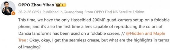 Conform informațiilor, OPPO Find N6 va fi primul pliabil echipat cu sistem quad-camera cu senzor principal de 200 MP. Pare că primește și o cameră telephoto de 50 MP, una ultrawide de 50 MP. Oficialul aduce în discuție și un nou obiectiv Danxia, care își face debutul odată cu acest model. Tot în postarea weibo e menționată și o versiune Find N6 Satellite Edition, conectivitatea satelitară fiind foarte populară în China. Nu va lipsi nici colaborarea cu Hasselblad, după cum era de așteptat.