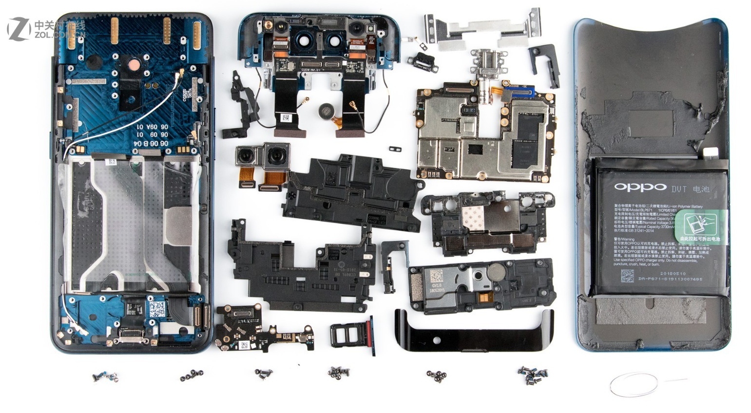 Pentru camera din spate avem un senzor Sony IMX519 de 16 megapixeli, cu stabilizare optică și suport HDR și RAW, dar și o cameră secundară de 20 MP. Cât despre desfacerea telefonului, e mai ușor de spus decât de realizat, Oppo Find X având o grămadă de lipici și multe componente mici și migăloase.