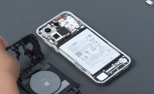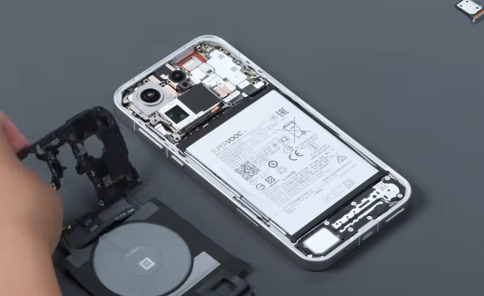 Telefonul e generos cu sigiliile pentru protecţia contra apei şi în spate avem şi acea bobină de încărcare wireless (50w), fixată cu câteva şuruburi. Spatele e complet realizat din sticlă, cu o zonă de metal în jurul camerei. O peliculă pentru disipare a căldurii e pusă între modulul foto periscop telephoto şi baterie, probabil realizată din cupru.