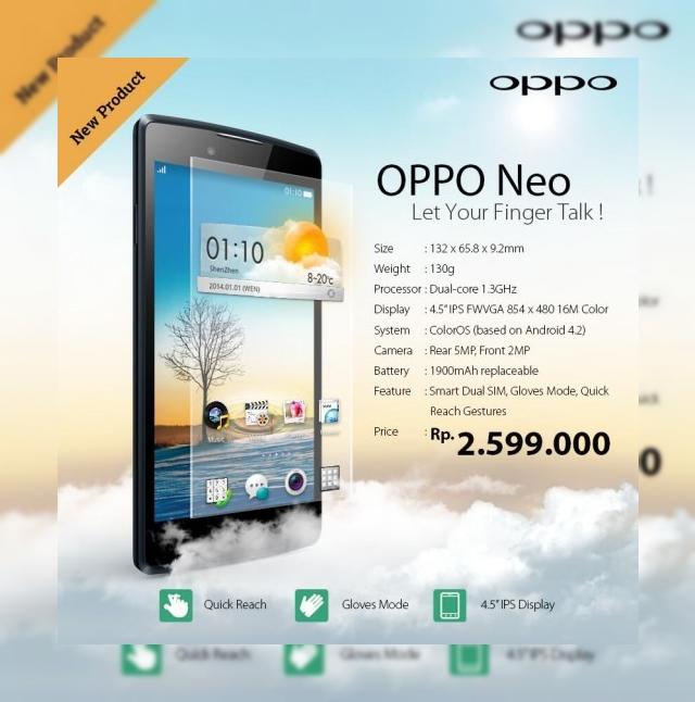 Nu cu mult timp în urmă, un teaser lansat de producătorul Oppo ne aducea la cunoștință apariția iminentă a smartphone-ului Neo, dotat cu ecran de 4.5 inch și ale cărui alte caracteristici se aflau la stadiul de mister. Astăzi terminalul își face debutul în Indonezia, împreună cu toate detaliile legate de facilitățile pe care le oferă.