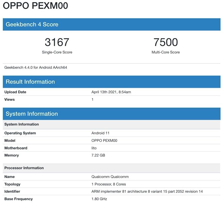 Listarea în cauză scoate la iveală prezența unui procesor Qualcomm octa-core cu numele de cod "lito" și care se dovedește a fi un Snapdragon 768G 5G. Pe această configurație avem 8 GB RAM și un alt detaliu dezvăluit constă în faptul că telefonul rulează Android 11 din fabrică. Obține 3167 puncte la testul single-core, respectiv 7500 puncte la multi-core, iar o mențiune aici, avem de-a face cu un test din GeekBench 4.
