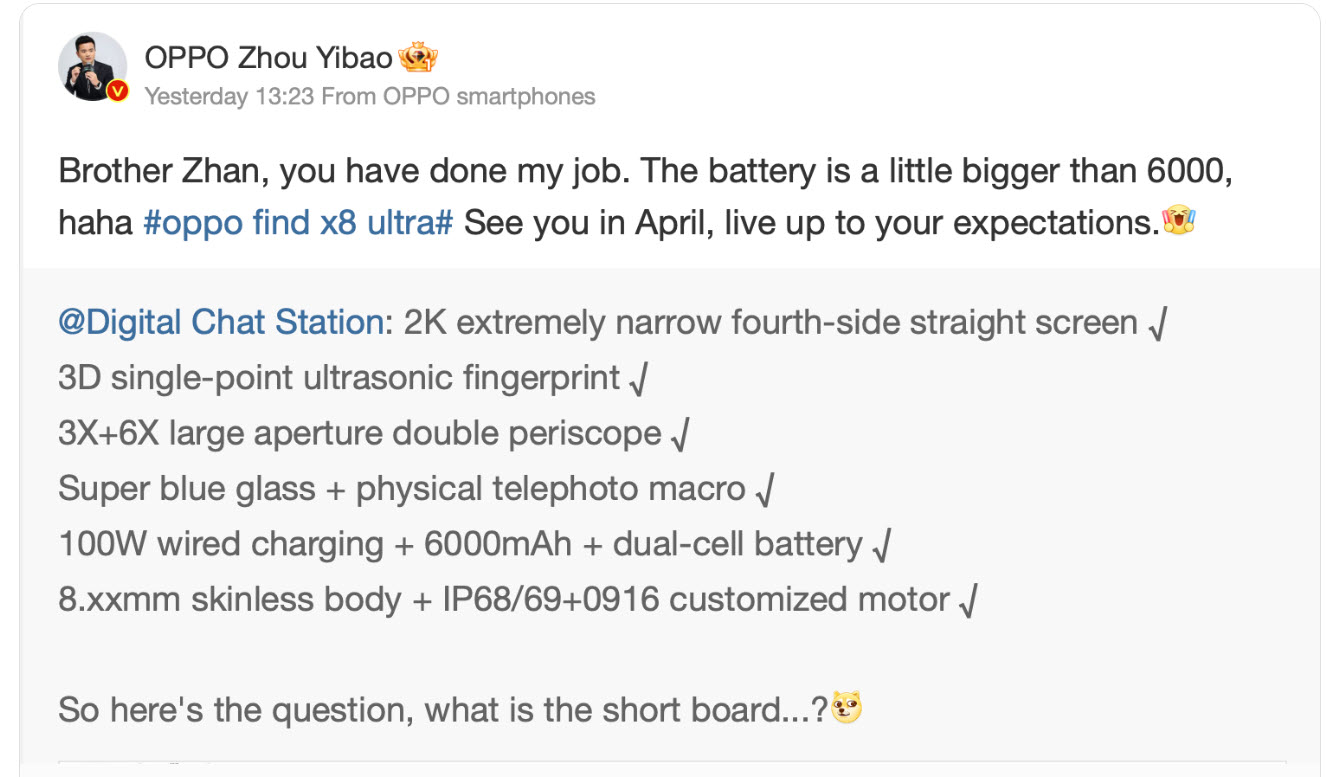 În general companiile tac sau neagă când vine vorba de scăpări de specificaţii ale unor telefoane încă nelansate. OPPO a ales o altă rută, răspunzând la postarea unui zvonac de pe Weibo cu privire la OPPO Find X8 Ultra. Compania știe cum să creeze hype, iar de data aceasta, managerul de produs al seriei Find, Zhou Yibao, a intrat direct în scenă pentru a confirma și corectă o scurgere de informații de la cunoscutul leaker Digital Chat Station.