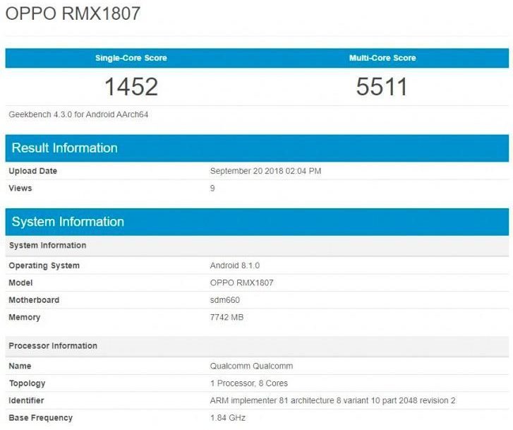 Nou venitul rulează Color OS 5.2, bazat pe Android 8.1 Oreo şi are numele de cod RMX1807, care a apărut în GeekBench recent. Ştim că va avea o cameră duală, probabil o combinaţie de 12 MP + 5 MP sau rezoluţii mai ridicate, plus o cameră selfie de 20 MP (speculăm). Are scanner de amprente şi noul tip de decupaj în ecran tip "picătură de apă".