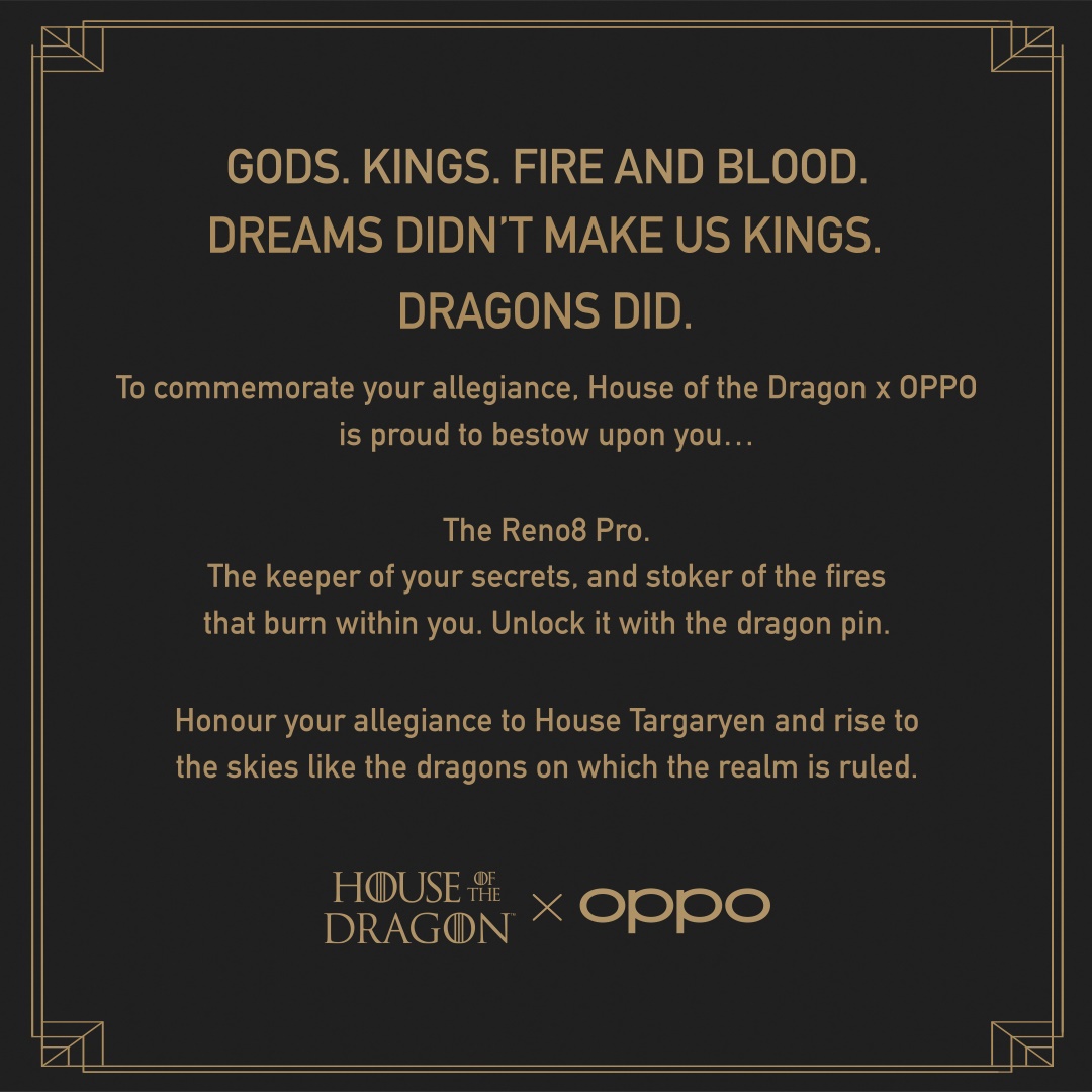 În România OPPO Reno8 Pro 5G tocmai ce a debutat. Totuși, în India a fost lansat în luna iulie, iar azi aflăm că urmează să debuteze în această regiune și o variantă în ediție limitată pentru fanii House of the Dragon. Avem deja teasere, debutul urmând să sosească curând. Totuși, nu știm dacă acest model va ajunge și în Europa. Detalii avem mai jos.