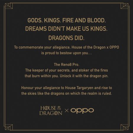 Conform teaser-ului, smartphone-ul va sosi într-o cutie specială care ar conține un așa-zis „set” House of the Dragon. Nu e încă clar dacă ce vedem în imaginea de mai sus e doar o husă sau chiar telefonul OPPO Reno8 Pro 5G cu un design personalizat. Totuși, vedem că adoptă un spate mat de culoare neagră, iar aici se află și o emblemă aurie House of the Dragon care arată foarte bine.