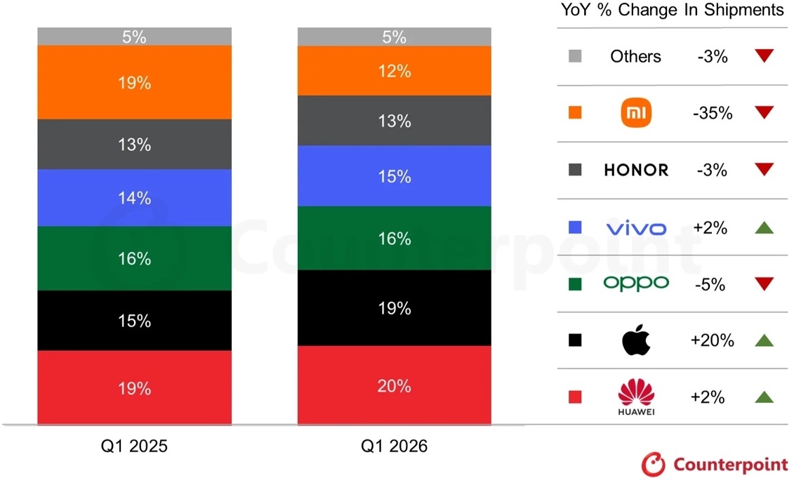 Am văzut deja cum arată piața smartphone la nivel global în primul trimestru al anului 2026. Ei bine, un nou raport publicat de CounterPoint Research arată și direcția pieței din China. Pare că vorbim despre o scădere de 4% la nivel de vânzări, comparativ cu aceeași perioadă a anului trecut. Principalele cauze sunt baza ridicată de comparație generată de subvențiile guvernamentale anterioare și creșterea costurilor pentru componente precum memoria. Detalii avem mai jos!