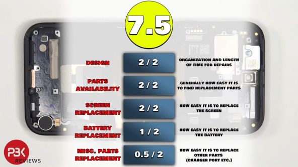 Pare că bateria nu se înlocuiește tocmai ușor, primind doar 1/ 2 puncte în cazul acestui pas. Greutăți încep să apară când vine vorba de înlocuirea componentelor mici, precum portul USB-C, difuzoare sau camere. Aici terminalul obține doar 0.5 / 2 puncte, iar scorul de reparabilitate oferit de către PBKReviews este de 7.5 / 10.