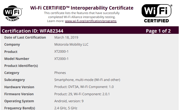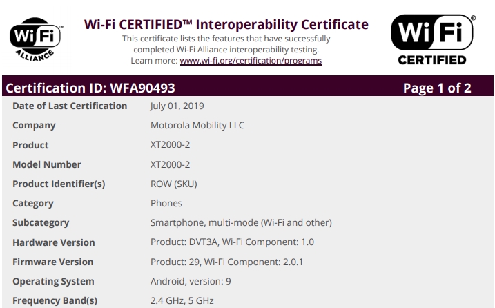 Pentru a trece rapid peste acest aspect, aflați că noul telefon dispune de suport Wi-Fi 802.11 a/b/g/n/ac (dual-band). Pe seama certificării aflăm că există două variante ale acestui smartphone, cea cu numele de cod XT2000-1 destinată pieței din SUA, respectiv cea cu nume de cod XT2000-2 așteptată să debuteze la nivel global, inclusiv pe plan european.