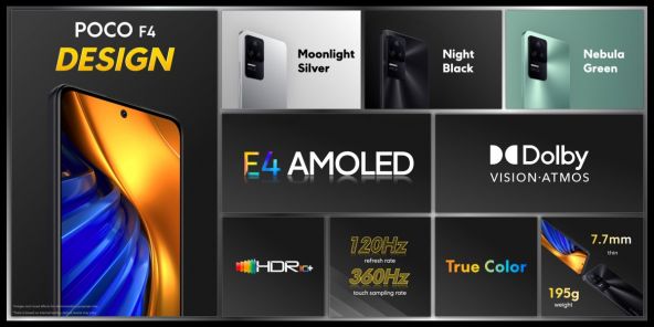 POCO F4 vine cu sticlă protejată Corning Gorilla Glass 5 în față și tot un panou din sticlă se află și în partea din spate. Cântărește 195 de grame și este rezistent la stropi de apă și praf, având certificare IP53. Aduce un display de 6.67 inch în diagonală AMOLED, refresh rate de 120Hz și rezoluție Full HD+. Acest panou are certificare Dolby Vision și aduce o luminozitate de până la 1300 de nits.