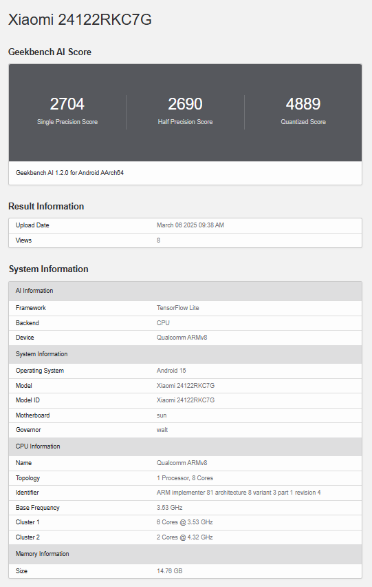 Conform informațiilor, POCO F7 Ultra a apărut în baza de date Geekbench AI sub numărul de model 24122RKC7G. Acesta rulează Android 15 și este echipat cu 16GB RAM, ceea ce îl plasează direct în zona flagship-urilor performante. Sub capotă apare un procesor Snapdragon 8 Elite, terminalul fiind gata să concureze cu cele mai bune modele de pe piață.