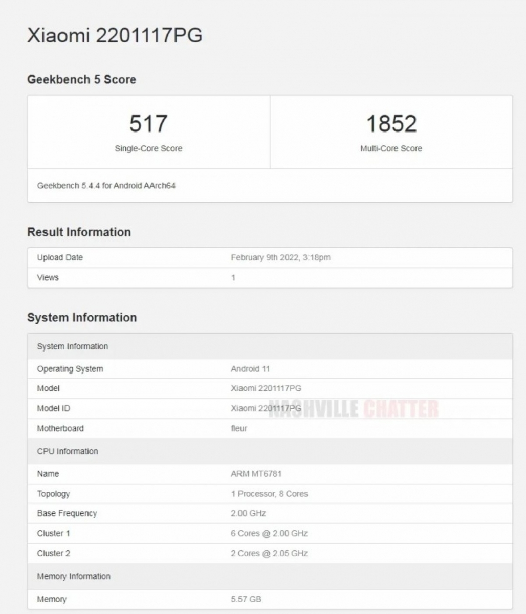Benchmark-ul cu pricina menționează telefonul cu numele de cod Xiaomi 2201117PG și cu un pachet hardware ce include procesorul octa-core MediaTek Helio G96, respectiv 6 GB RAM. Ajunge la un scor de 517 puncte (single-core), respectiv 1852 puncte (multi-core).