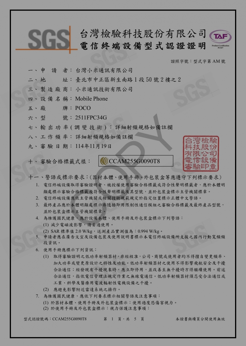 E vorba despre o certificare SGS, pe care a primit-o acest terminal. Are numele de cod 2511FPC34G, confirmând suportul Bluetooth, Wi-Fi, NFC și 5G. Benzile suportate sunt n1, n3, n7, n8, n28, n38, n41 și n78. Listarea confirmă un port USB-C și o baterie cu eticheta BM6Q. Bateria de 6500 mAh e listată cu o valoare de 6330 mAh.