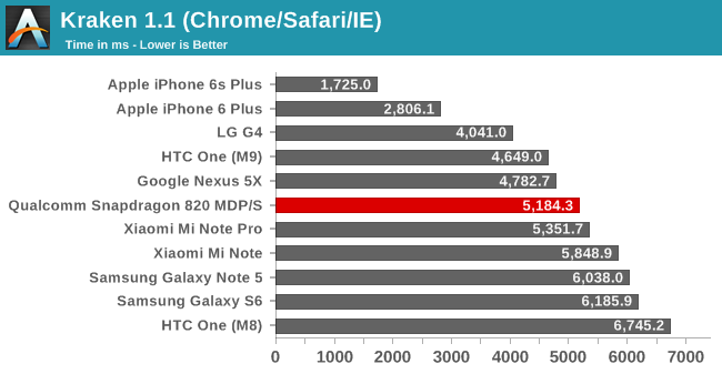 În 3D Mark Ice Storm Unlimited, terminalul cu rol de referinţă a obţinut 41.021 puncte pe partea de grafică, cu puţin sub iPhone 6S Plus (41.931), dar depăşind Xiaomi Mi Note Pro (38.318) şi HTC One M9 (32.181). În Basemark OS II 2.0 la testul web a atins 1021 de puncte, faţă de cele 1202 ale lui iPhone 6S Plus şi cele 978 ale lui Galaxy S6.
