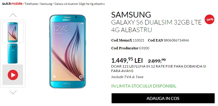 Ieri, în cadrul unui articol dedicat vă informam despre o campanie de reduceri foarte atractivă desfășurată de către cei de la QuickMobile, retailer care afișa prețuri foarte bune chiar și pentru cele mai noi flagship-uri de pe piață. Un astfel de exemplu era și Samsung Galaxy S6, telefon ce în versiunea albastră costa 1.449 lei. Lista completă de prețuri afișate greșit, poate fi găsită aici.
